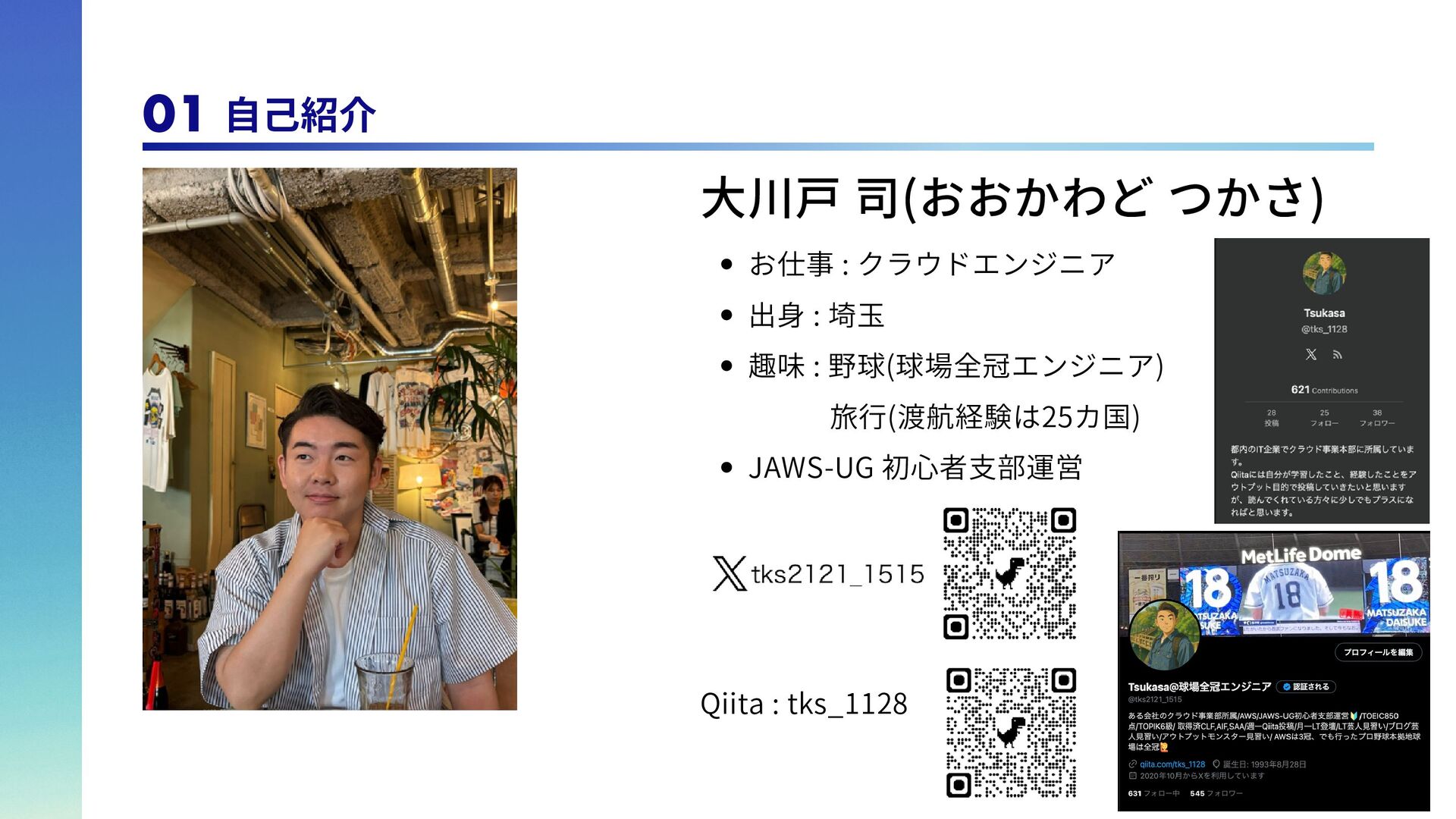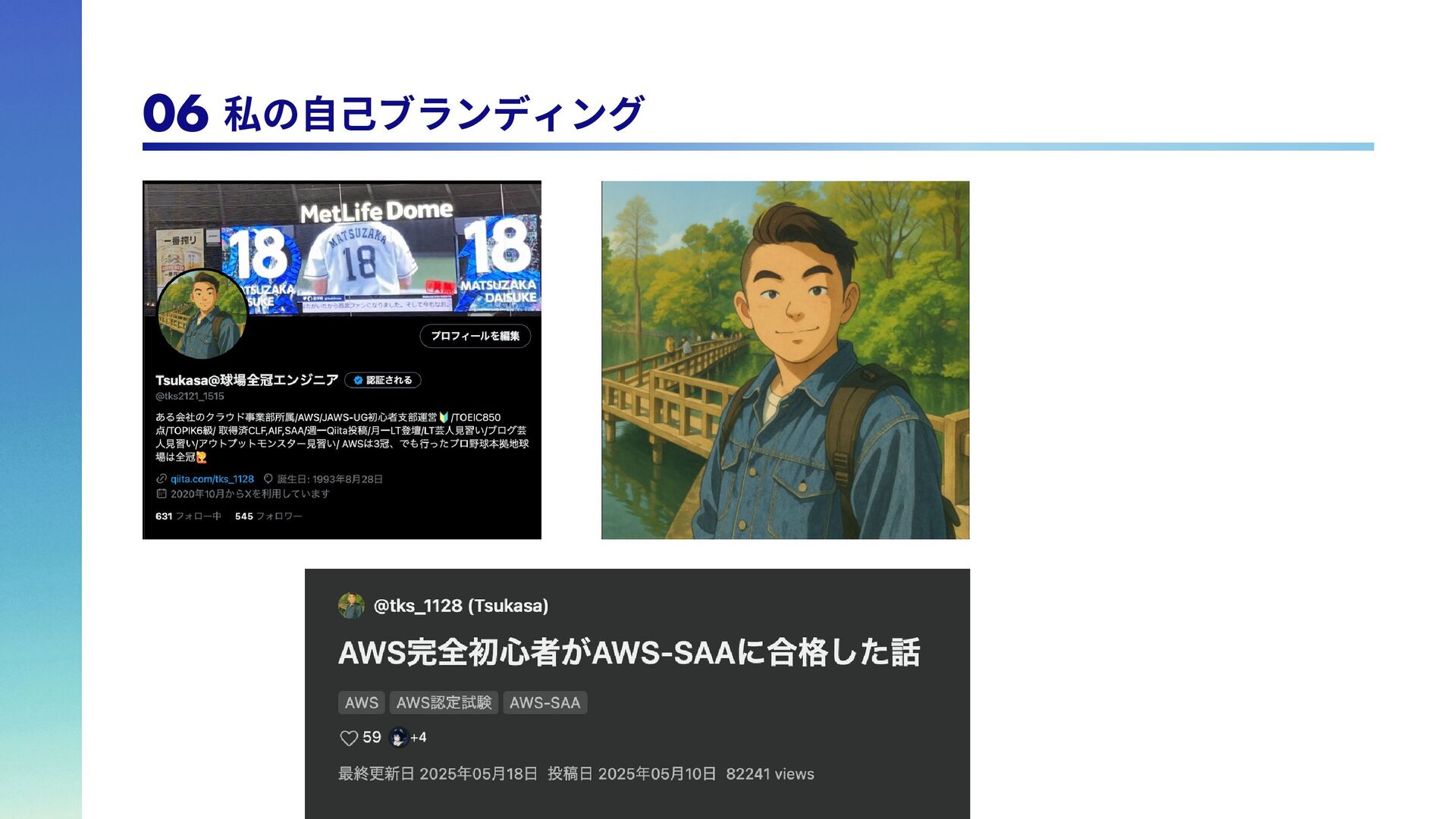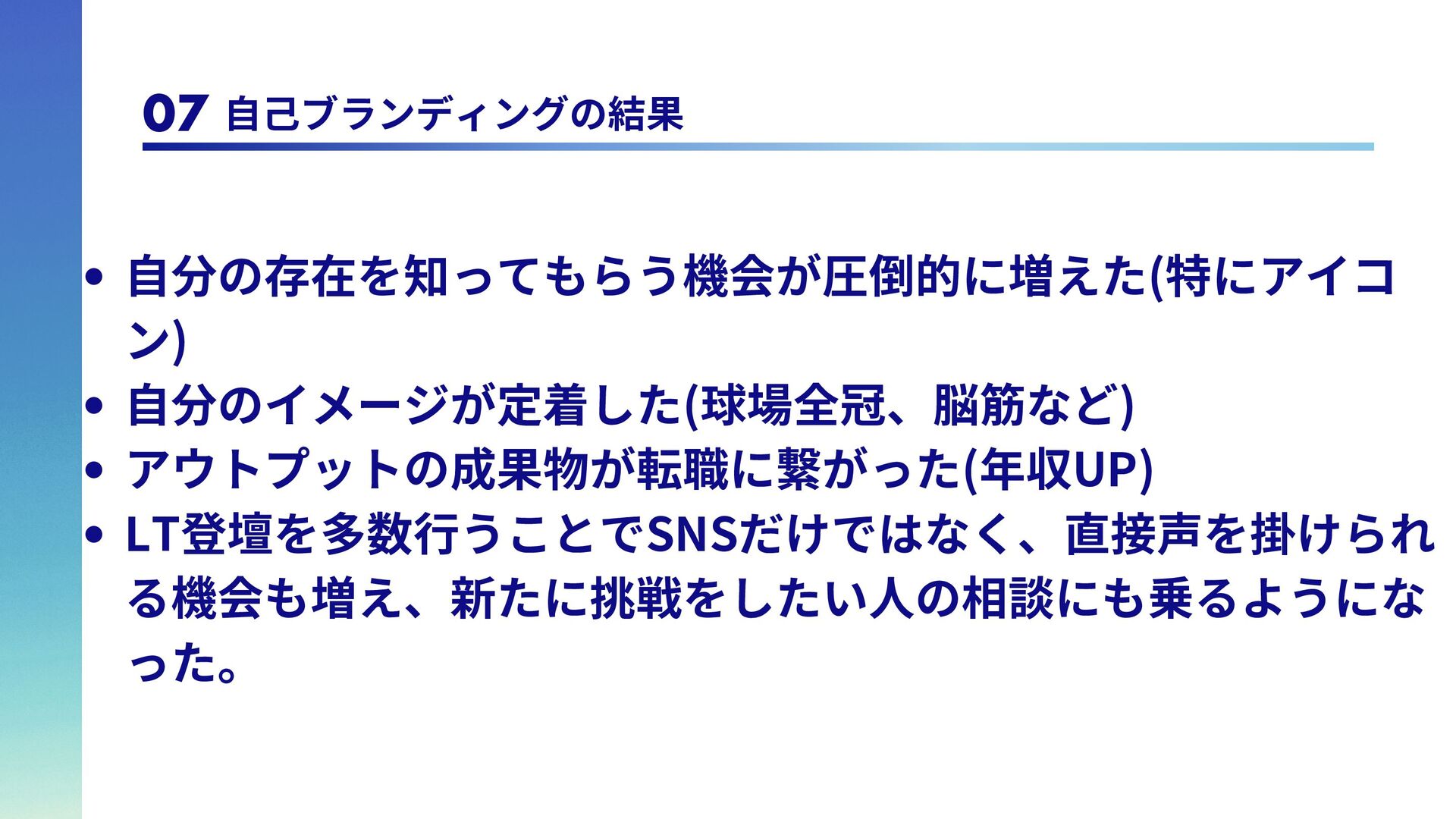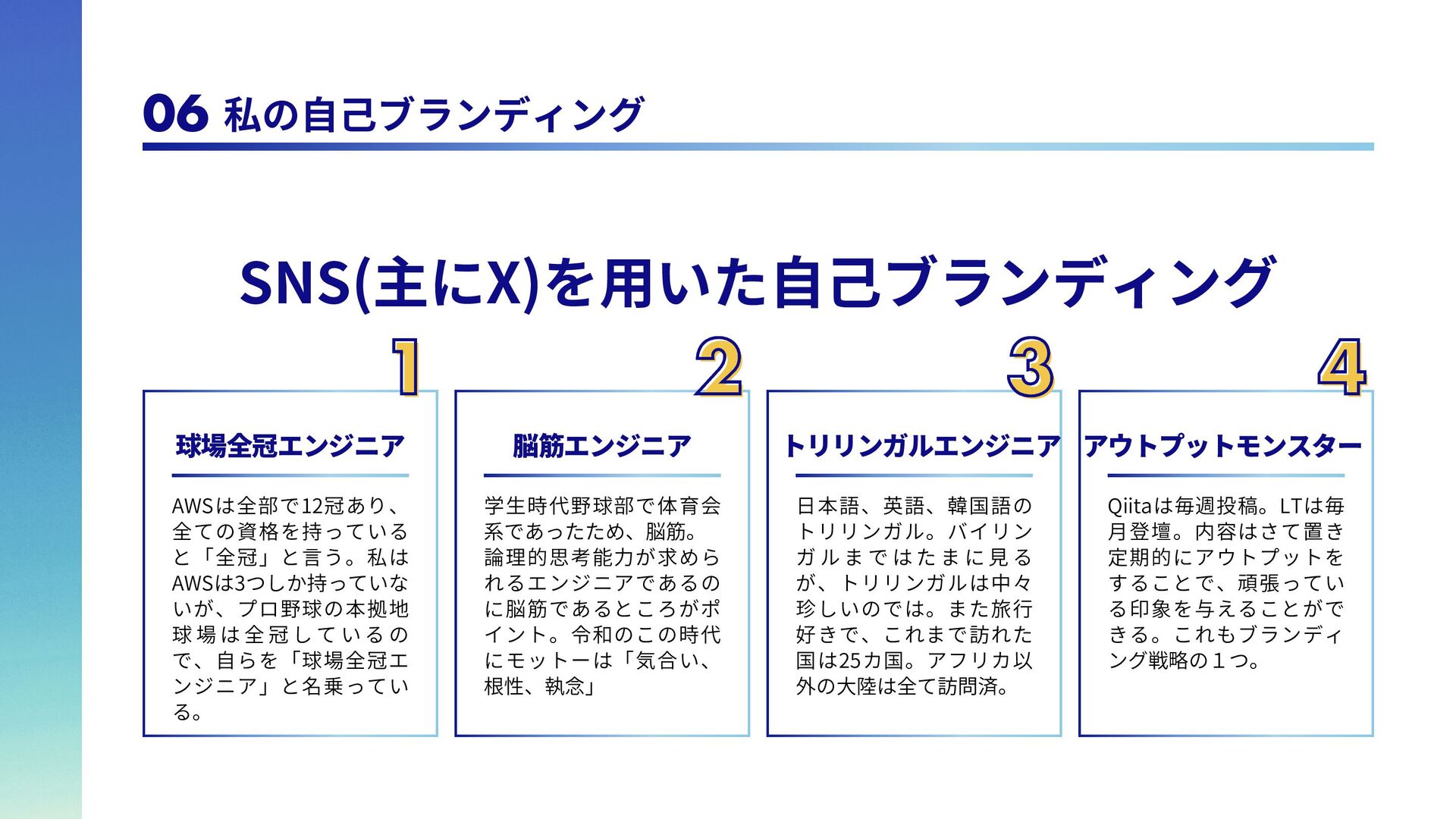 は 全 冠 し て い る の で、自らを「球場全冠エ ンジニア」と名乗ってい る。 脳筋エンジニア 学生時代野球部で体育会 系であったため、脳筋。 論理的思考能力が求めら れるエンジニアであるの に脳筋であるところがポ イント。令和のこの時代 にモットーは「気合い、 根性、執念」 トリリンガルエンジニア 日本語、英語、韓国語の トリリンガル。バイリン ガ ル ま で は た ま に 見 る が、トリリンガルは中々 珍しいのでは。また旅行 好きで、これまで訪れた 国は25カ国。アフリカ以 外の大陸は全て訪問済。 1 1 2 2 3 3 4 4 アウトプットモンスター Qiitaは毎週投稿。LTは毎 月登壇。内容はさて置き 定期的にアウトプットを することで、頑張ってい る印象を与えることがで きる。これもブランディ ング戦略の1つ。 06