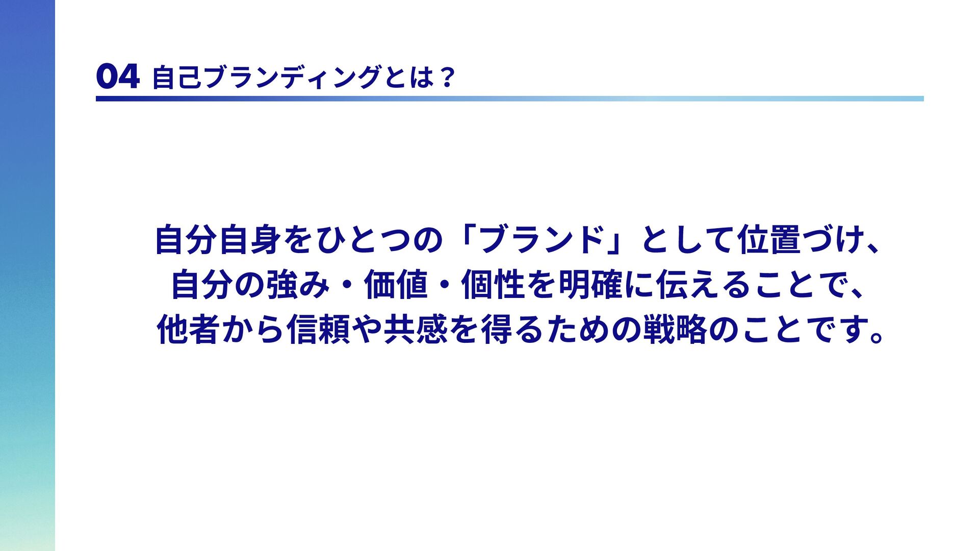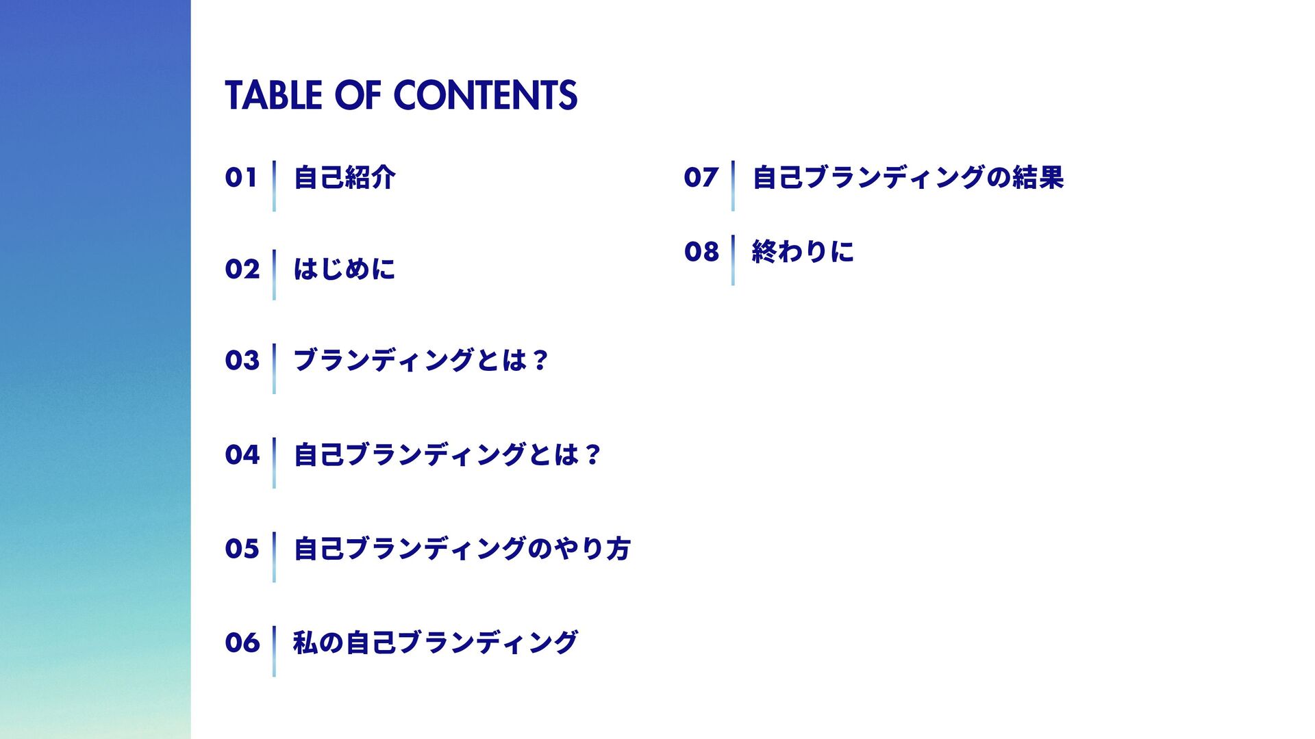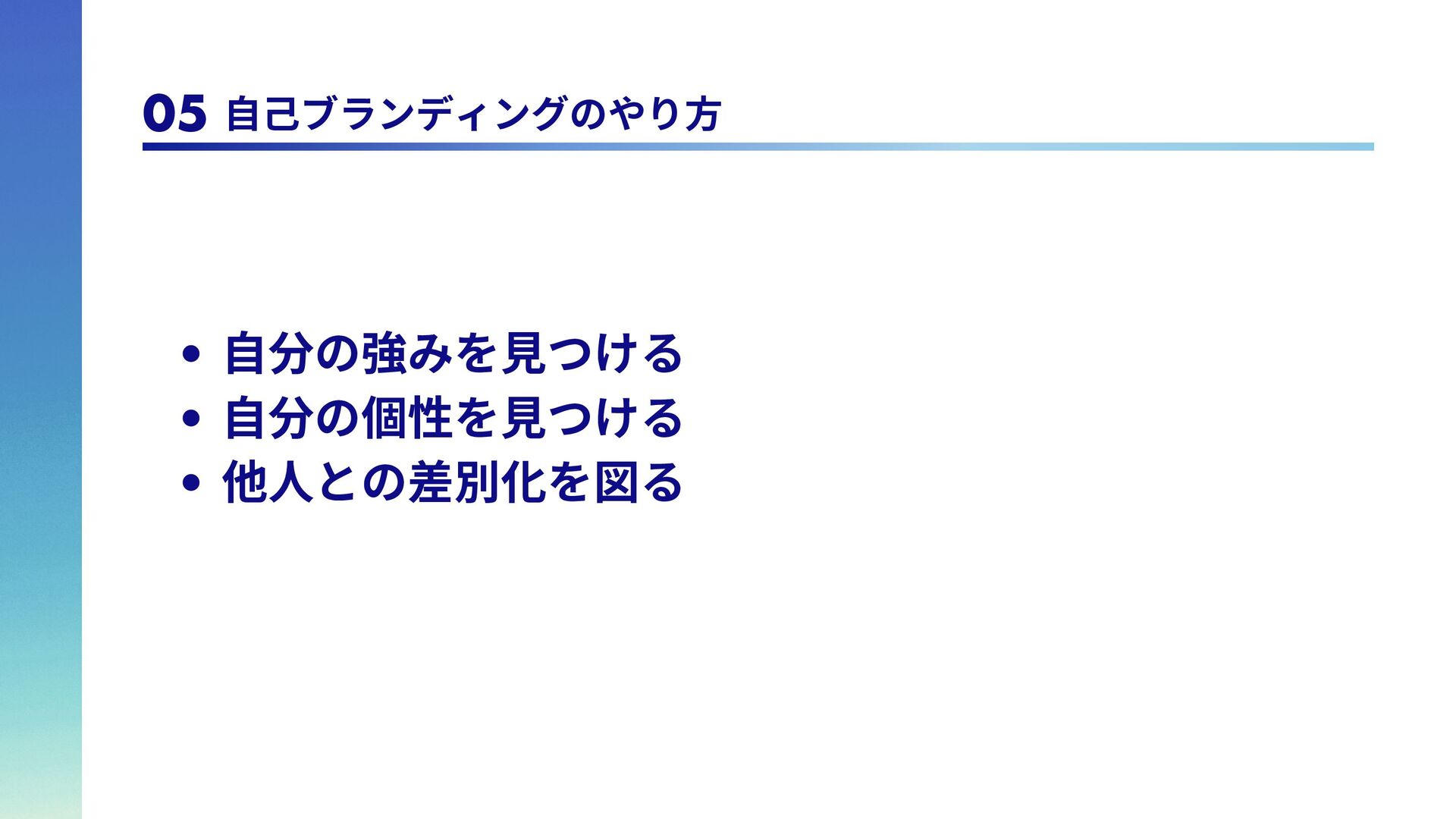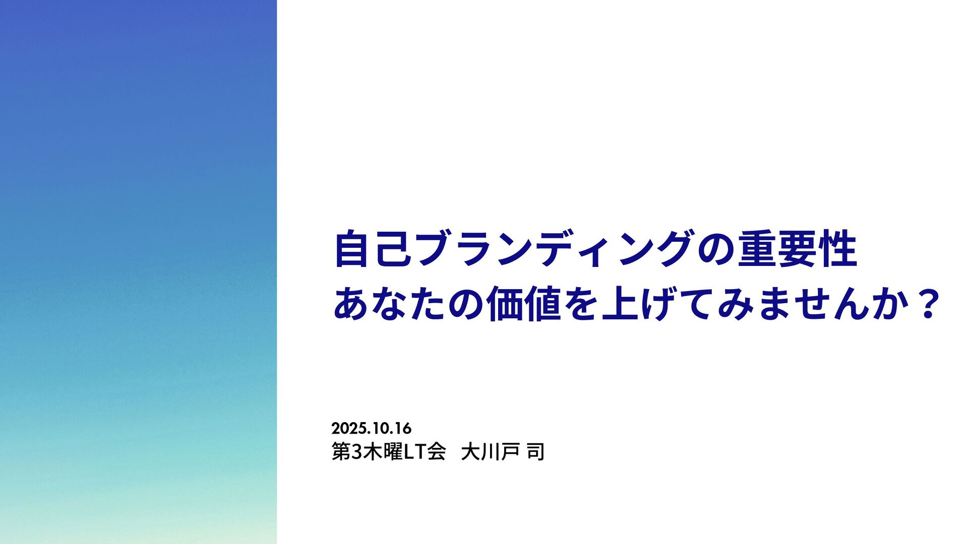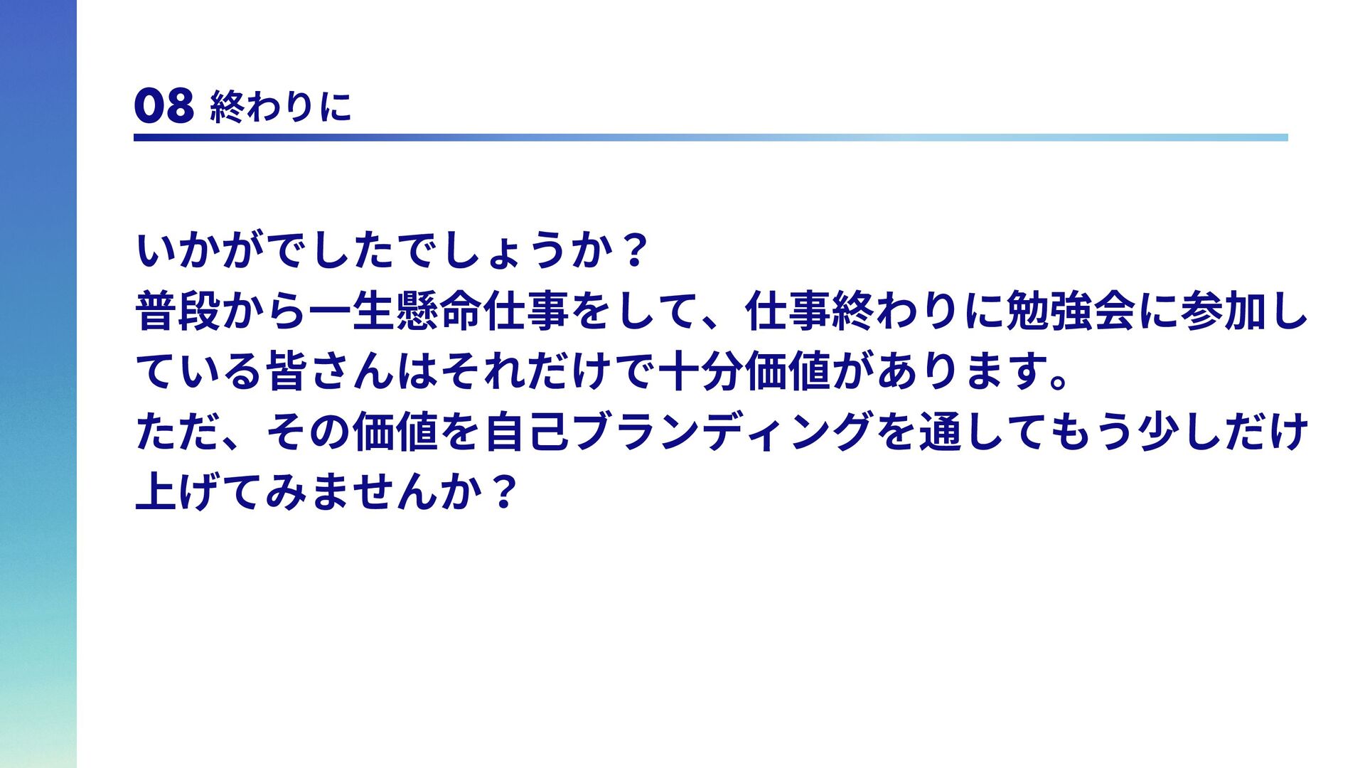 は 全 冠 し て い る の で、自らを「球場全冠エ ンジニア」と名乗ってい る。 脳筋エンジニア 学生時代野球部で体育会 系であったため、脳筋。 論理的思考能力が求めら れるエンジニアであるの に脳筋であるところがポ イント。令和のこの時代 にモットーは「気合い、 根性、執念」 トリリンガルエンジニア 日本語、英語、韓国語の トリリンガル。バイリン ガ ル ま で は た ま に 見 る が、トリリンガルは中々 珍しいのでは。また旅行 好きで、これまで訪れた 国は25カ国。アフリカ以 外の大陸は全て訪問済。 1 1 2 2 3 3 4 4 アウトプットモンスター Qiitaは毎週投稿。LTは毎 月登壇。内容はさて置き 定期的にアウトプットを することで、頑張ってい る印象を与えることがで きる。これもブランディ ング戦略の1つ。 06