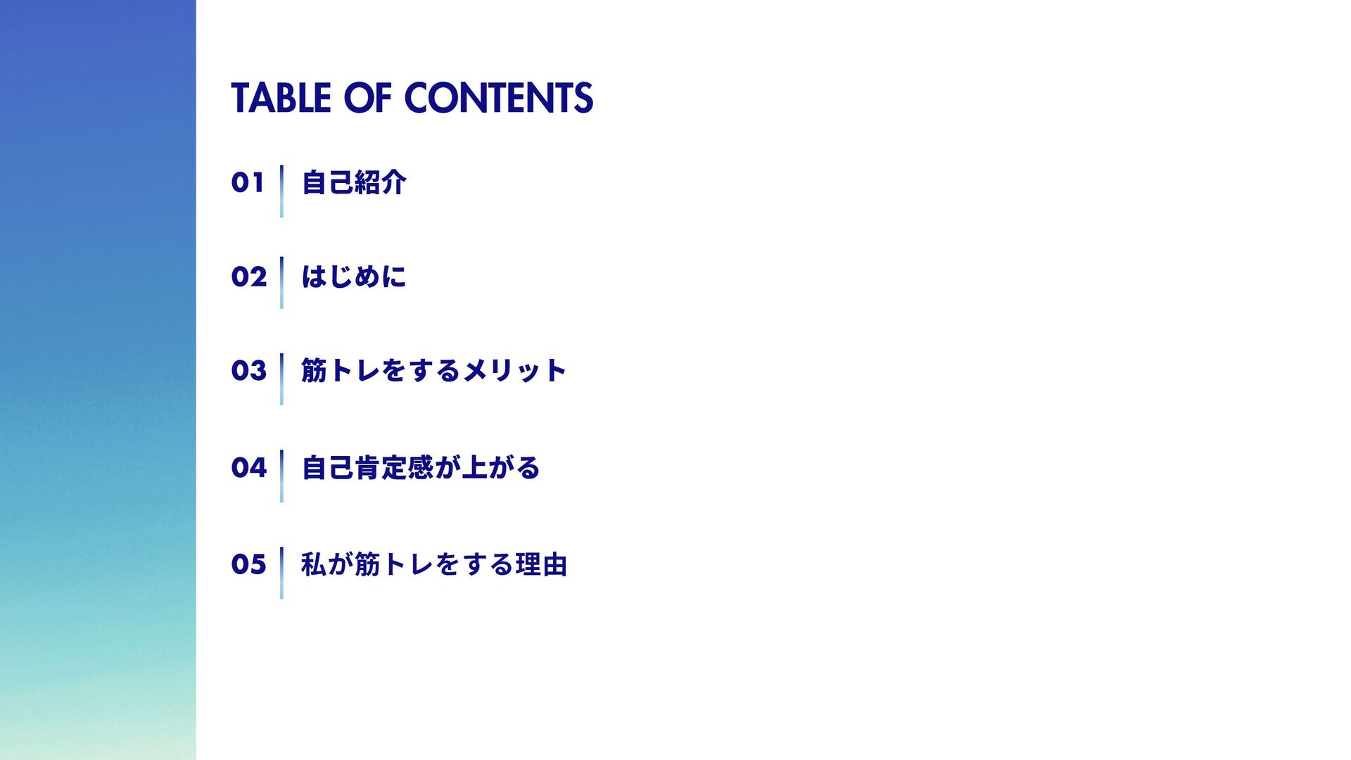 03 01 02 04 05 TABLE OF CONTENTS 筋トレをするメリット 自己紹介