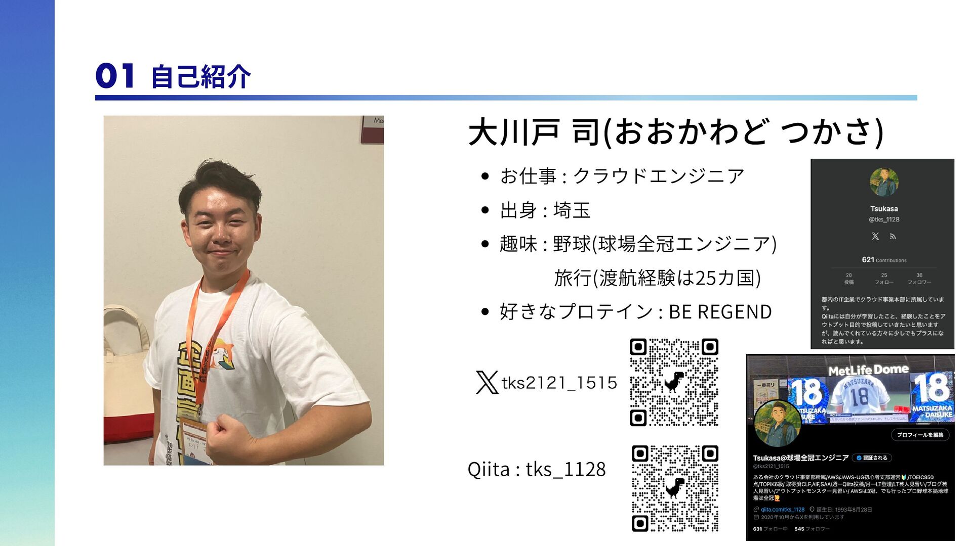 趣味 : 野球(球場全冠エンジニア) 旅行(渡航経験は25カ国) 好きなプロテイン : BE REGEND Qiita : tks_1128 自己紹介