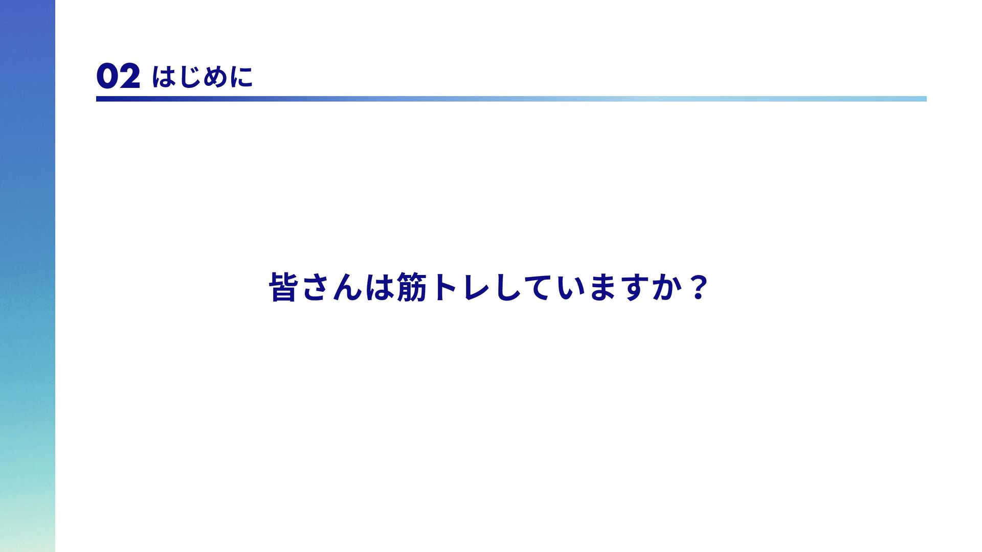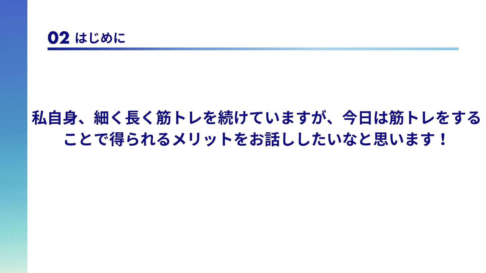 02 私自身、細く長く筋トレを続けていますが、今日は筋トレをする ことで得られるメリットをお話ししたいなと思います! はじめに