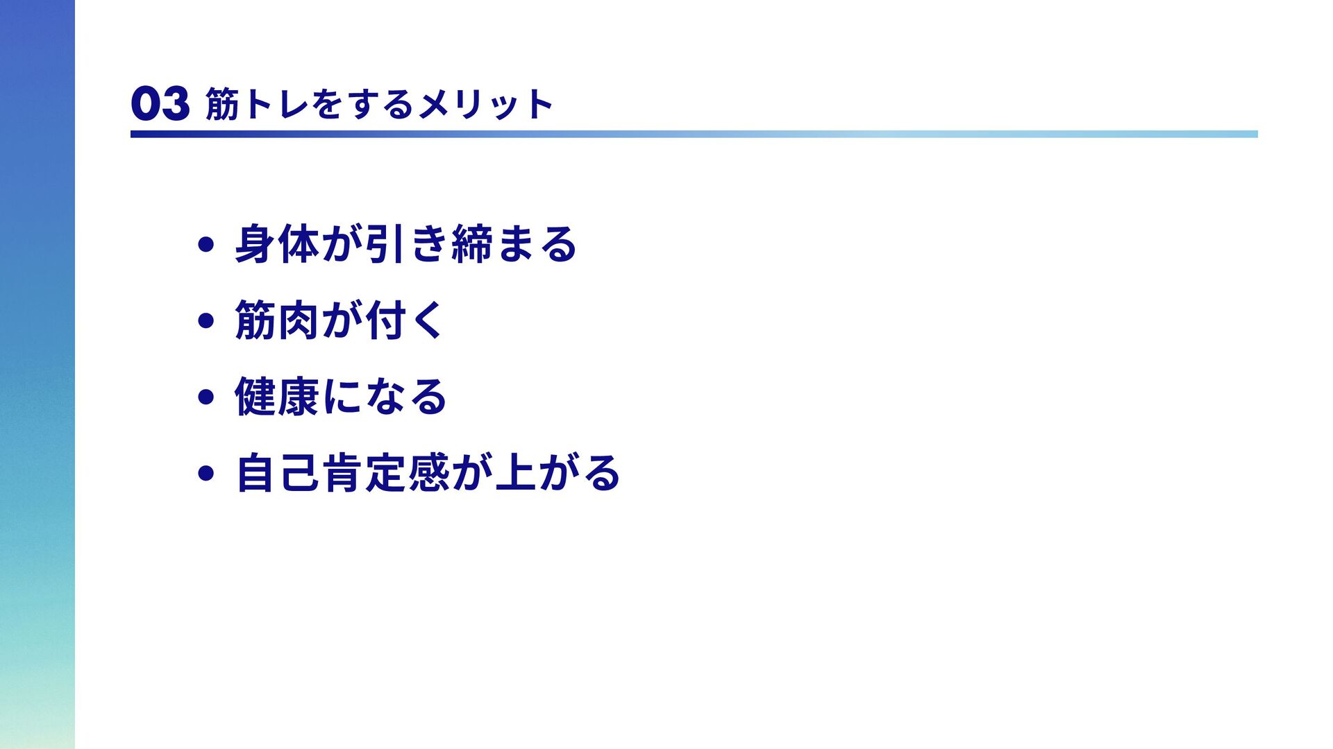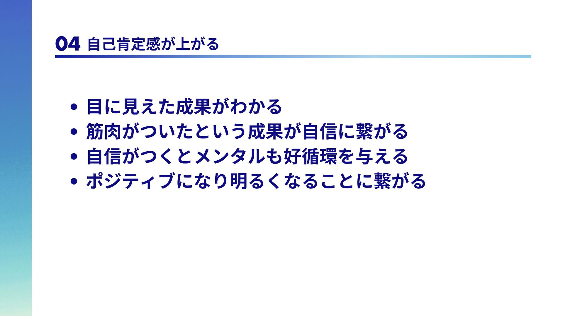 03 筋トレをするメリット 身体が引き締まる 筋肉が付く 健康になる 自己肯定感が上がる