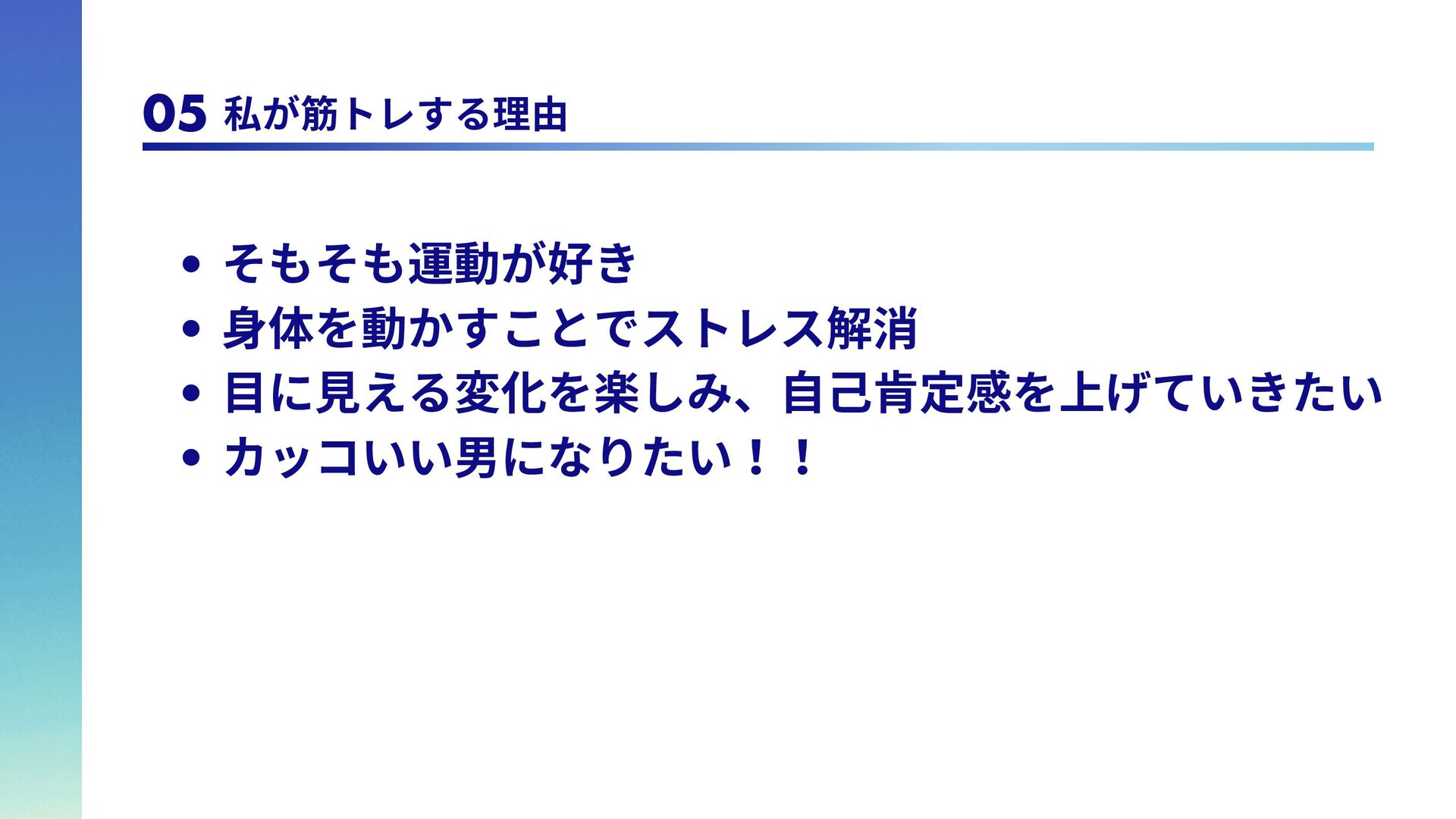 05 そもそも運動が好き 身体を動かすことでストレス解消 目に見える変化を楽しみ、自己肯定感を上げていきたい カッコいい男になりたい!! 私が筋トレする理由