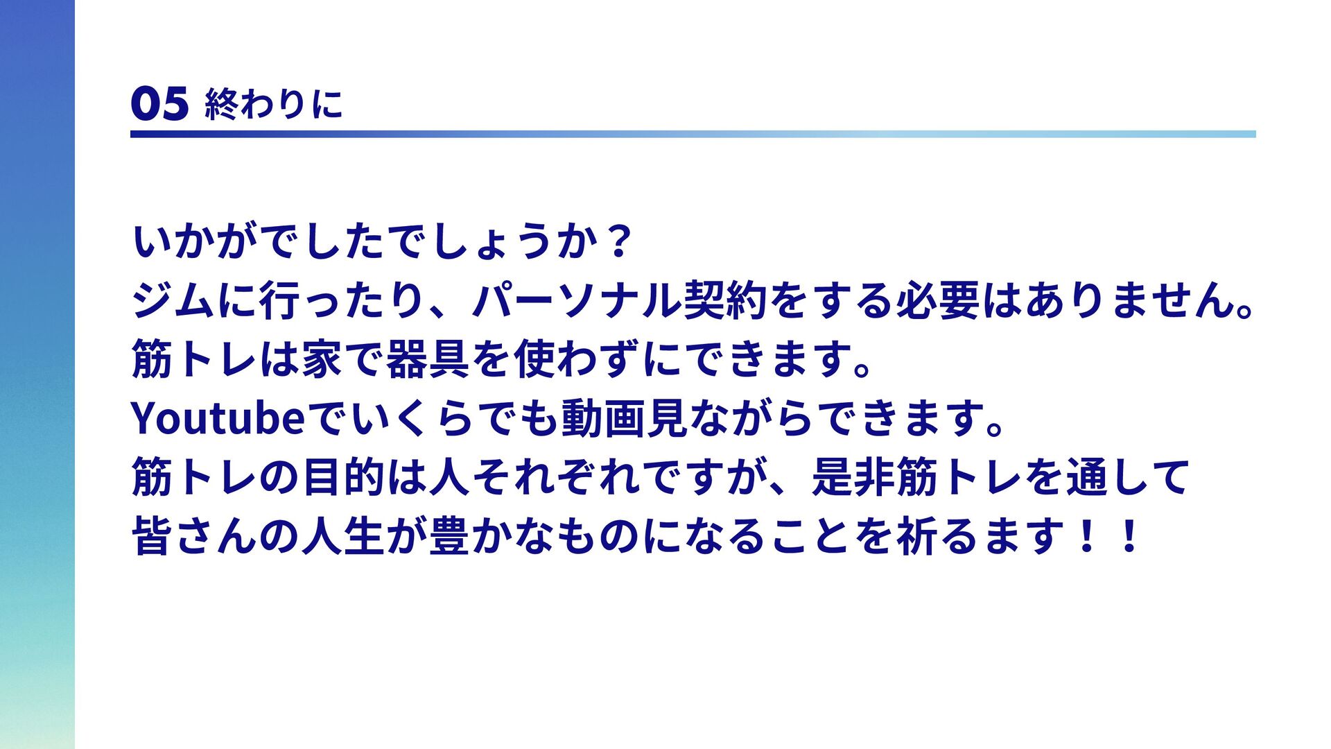 05 いかがでしたでしょうか? ジムに行ったり、パーソナル契約をする必要はありません。 筋トレは家で器具を使わずにできます。 Youtubeでいくらでも動画見ながらできます。 筋トレの目的は人それぞれですが、是非筋トレを通して 皆さんの人生が豊かなものになることを祈るます!! 終わりに