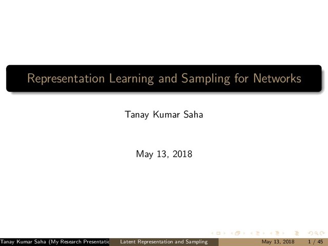 7 6 9 8 10 11 12 (a) 1 5,6,7,8,9,10 2 5,6,7,8,10 3 5,6,7,8,9,10 4 5,6,8,9 (b) (a) Left: A graph G with the current state of random walk; Right: Neighborhood information of the current state (1,2,3,4) 1 2 3 4 5 7 6 9 8 10 11 12 (a) 1 4,9 2 4,5,6,9,12 3 4,9 8 4,5,6,9 (b) (b) Left: The state of random walk on G (Figure 8a) after one transition; Right: Updated Neighborhood information Figure: Neighbor generation mechanism For this example, dx = 21, dy = 13 Tanay Kumar Saha (My Research Presentation) Latent Representation and Sampling May 13, 2018 35 / 45