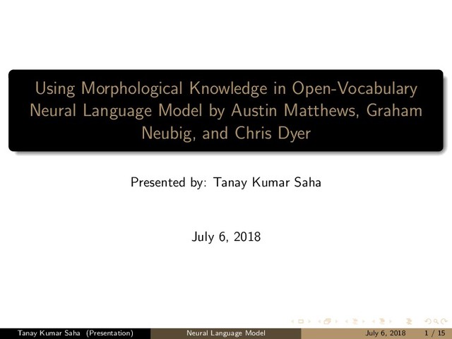 Matthews, Graham Neubig, and Chris Dyer Presented by: Tanay Kumar Saha July 6, 2018 Tanay Kumar Saha (Presentation) Neural Language Model July 6, 2018 1 / 15