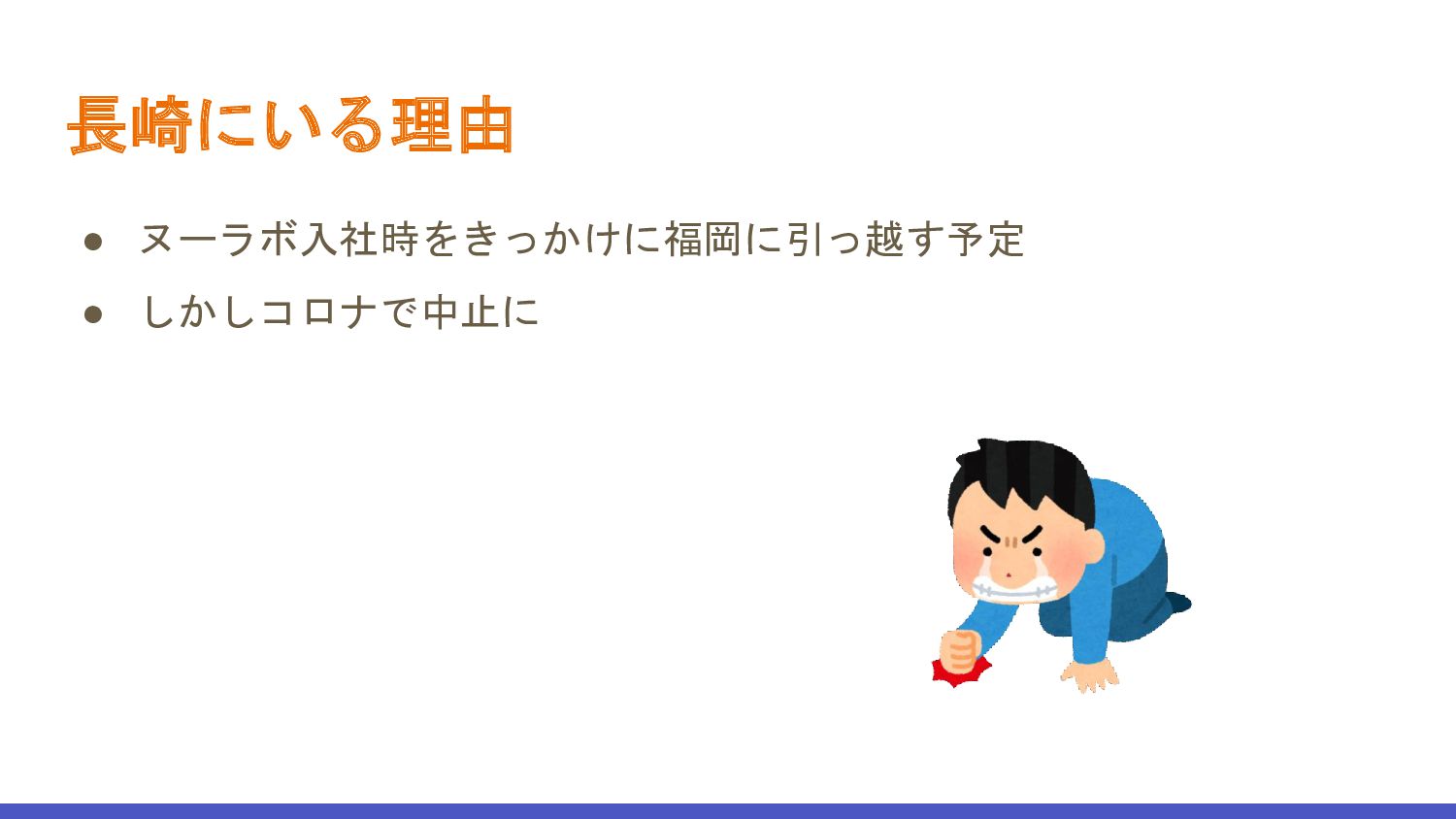 長崎にいる理由 • ヌーラボ入社時をきっかけに福岡に引っ越す予定 • しかしコロナで中止に