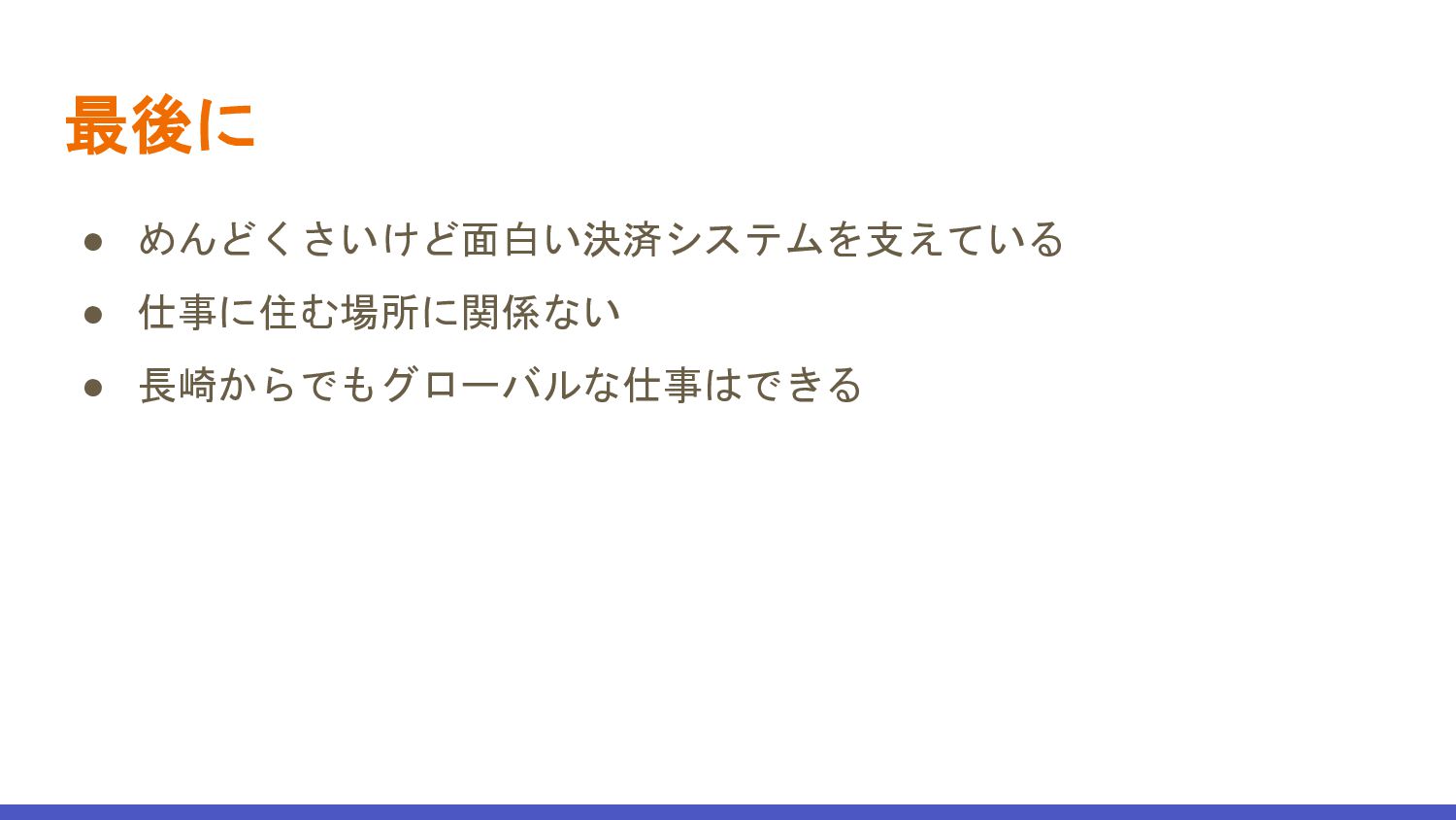 最後に • めんどくさいけど面白い決済システムを支えている • 仕事に住む場所に関係ない • 長崎からでもグローバルな仕事はできる