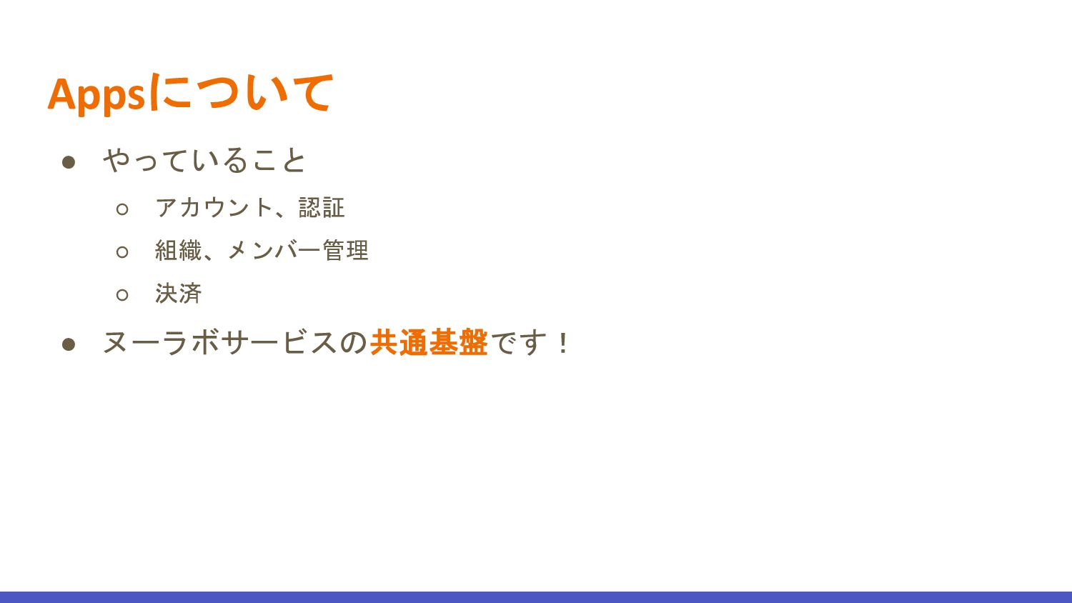 Appsについて • やっていること ◦ アカウント、認証 ◦ 組織、メンバー管理 ◦ 決済 •