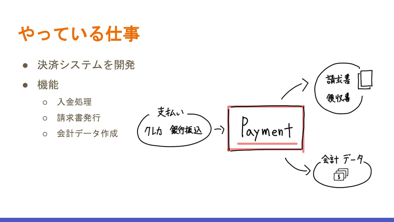 やっている仕事 • 決済システムを開発 • 機能 ◦ 入金処理 ◦ 請求書発行 ◦