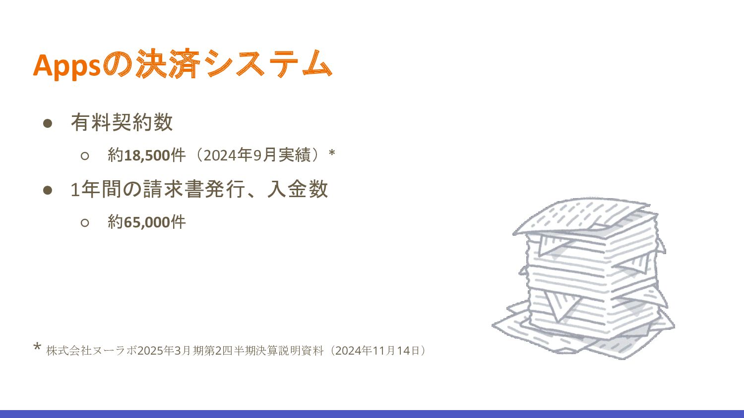 Appsの決済システム • 有料契約数 ◦ 約18,500件(2024年9月実績)* • 1年間の請求書発行、入金数 ◦ 約65,000件 *