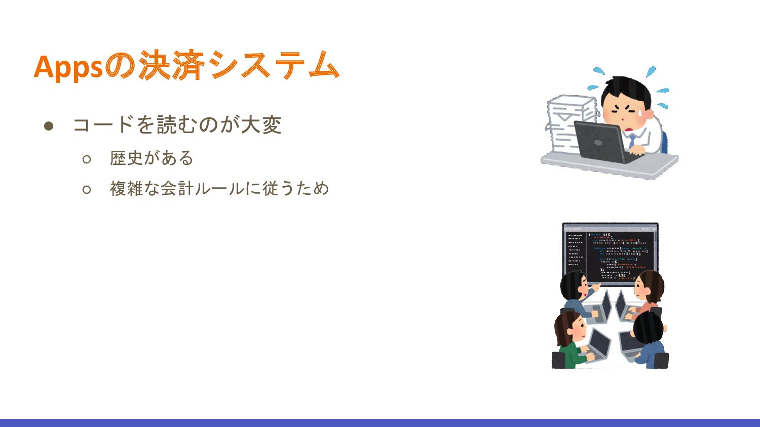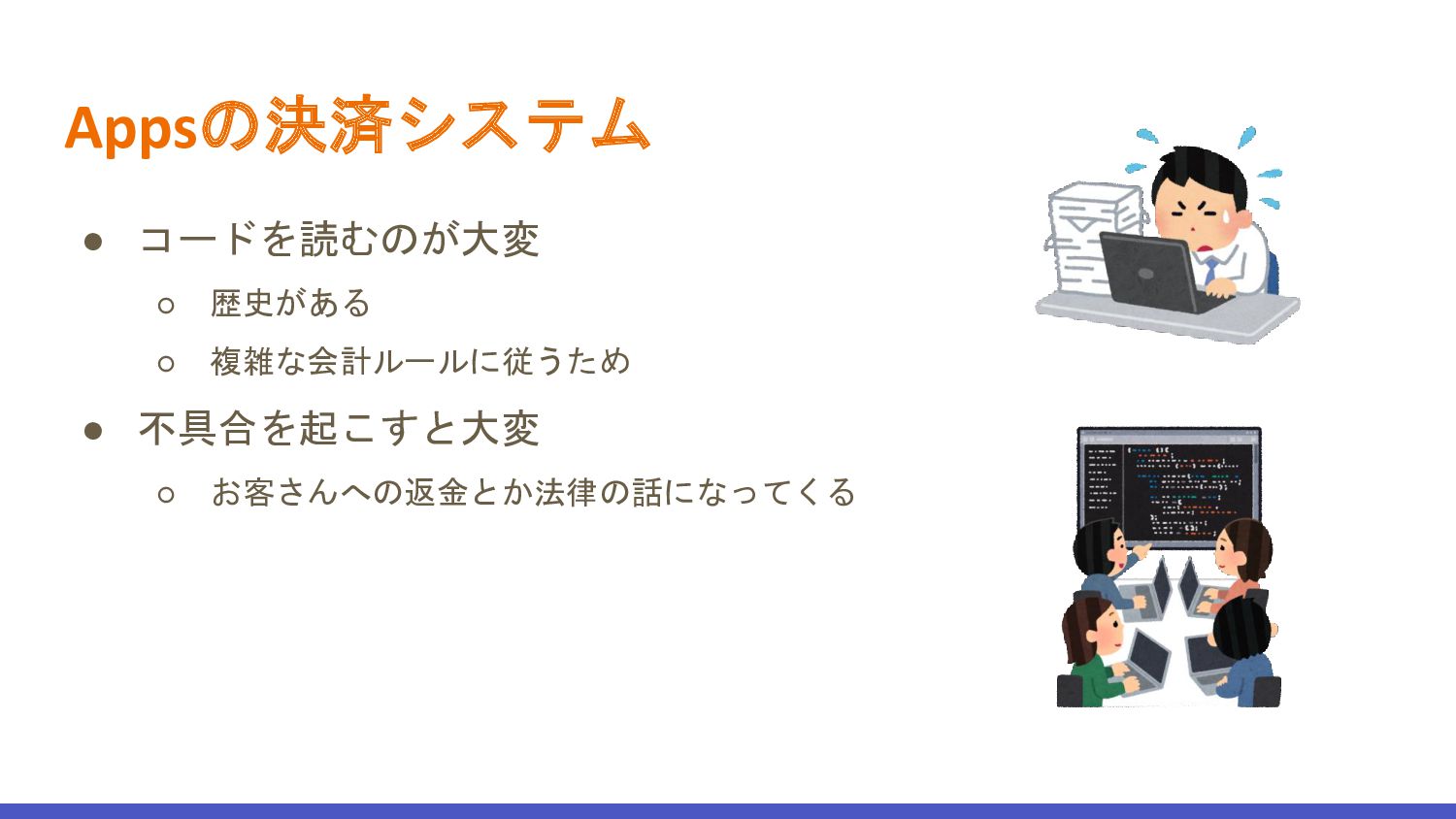 Appsの決済システム • コードを読むのが大変 ◦ 歴史がある ◦ 複雑な会計ルールに従うため • 不具合を起こすと大変 ◦