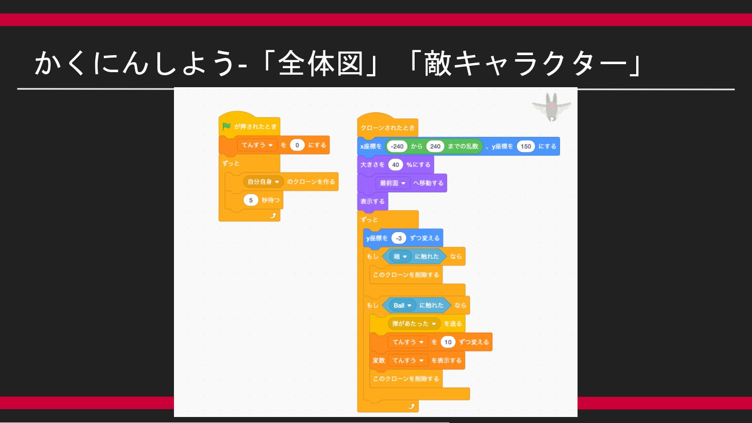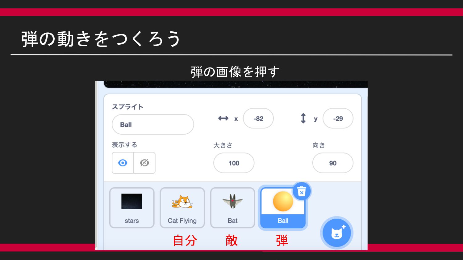 尚、こちらに今回のシューティングゲーム見本のURLを載せておきます。https://scratch.mit.edu/projects/722589287