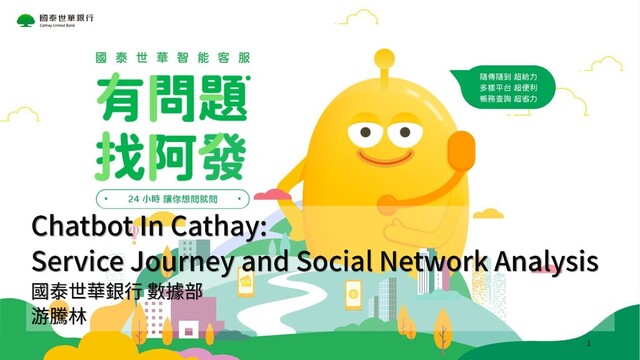 有越來越多的公司嘗試導入 Chatbot 期望降低客服人員的工作量,而 Chatbot 成功的關鍵就在於設計良好的服務旅程讓客戶能快速並滿意的完成服務。在這場專題演講中,講者將與大家分享國泰是如何透過社群網絡分析 (SNA) 來設計與優化 Chatbot 中的服務旅程。