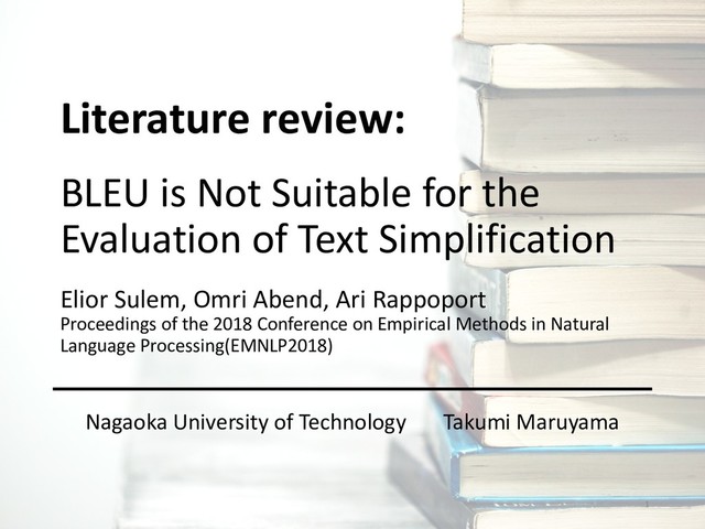 splits − Wiki-8REF( ) − Six MT-based simplification systems (NTS, SBMT-SARI etc.) • All systems/Corpora − Wiki-8REF + HSplit − Six MT-based simplification systems (NTS, SBMT-SARI etc.) Ø HSplit as Reference Setting − HSplit − Six sentence splitting systems (DSS, SEMoses etc.) 11