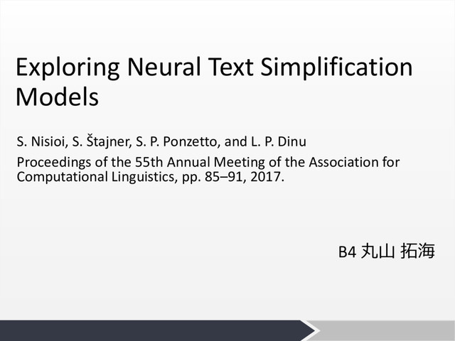 P. Ponzetto, and L. P. Dinu Proceedings of the 55th Annual Meeting of the Association for Computational Linguistics, pp. 85–91, 2017. B4 丸⼭ 拓海