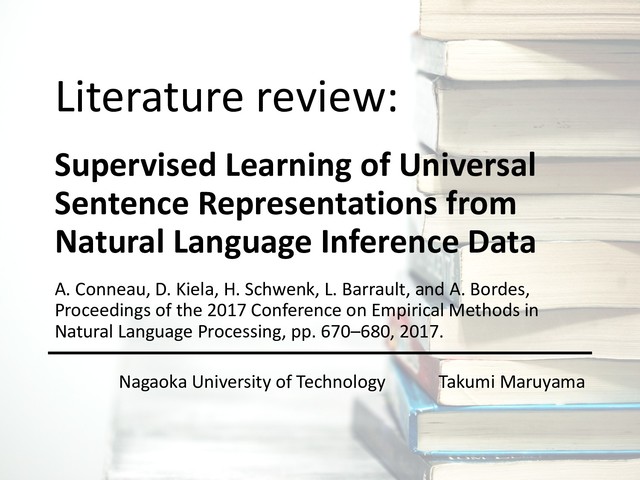 Data A. Conneau, D. Kiela, H. Schwenk, L. Barrault, and A. Bordes, Proceedings of the 2017 Conference on Empirical Methods in Natural Language Processing, pp. 670–680, 2017. Nagaoka University of Technology Takumi Maruyama Literature review: