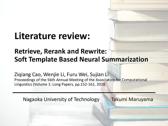 Cao, Wenjie Li, Furu Wei, Sujian Li Proceedings of the 56th Annual Meeting of the Association for Computational Linguistics (Volume 1: Long Papers), pp.152-161, 2018 Nagaoka University of Technology Takumi Maruyama Literature review: