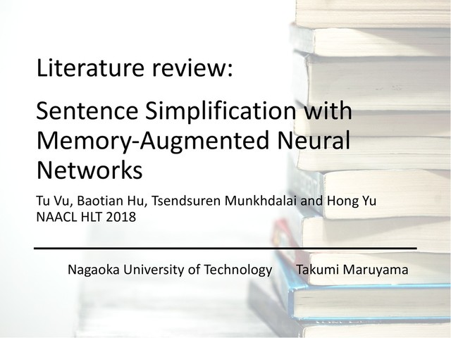 sequence models • LSTMLSTM: The encoder is implemented by LSTM • NSELSTM: The encoder is implemented by NSE Ø Models were tuned on the development sets, either with BLEU (-B) or SARI (-S) Dataset Train Dev. Test Newsela 94,208 1,129 1,077 Wikismall 88,837 205 100 Wikilarge 296,402 2,000 359 6