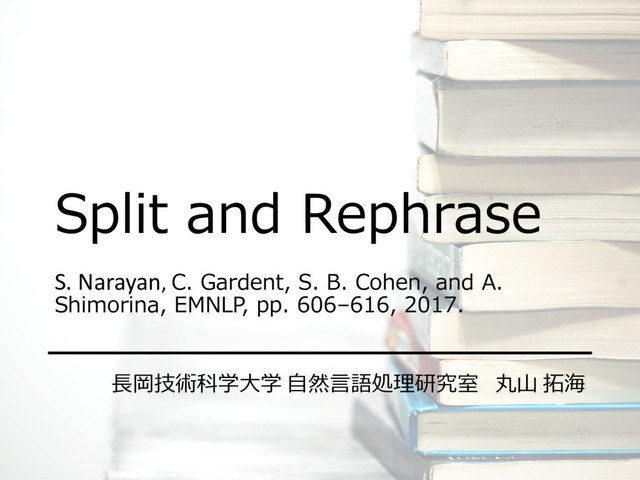 Loria, “Creating Training Corpora for NLG Micro-Planning,” In Proceedings of ACL, 2017. [2] S. Narayan, D. Lorraine, and C. Gardent, “Hybrid Simplification using Deep Semantics and Machine Translation,” Proceedings of the 52nd Annual Meeting of the Association for Computational Linguistics, pp. 435–445, 2014. [3] M. Luong, H. Pham, and C. D. Manning, “Effective Approaches to Attention based Neural Machine Translation,” Proceedings of the 2015 Conference on Empirical Methods in Natural Language Processing, pp. 1412–1421, 2015. [4] B. Zoph and K. Knight, “Multi-Source Neural Translation,” Proceedings of NAACL-HLT, pp. 30–34, 2016.