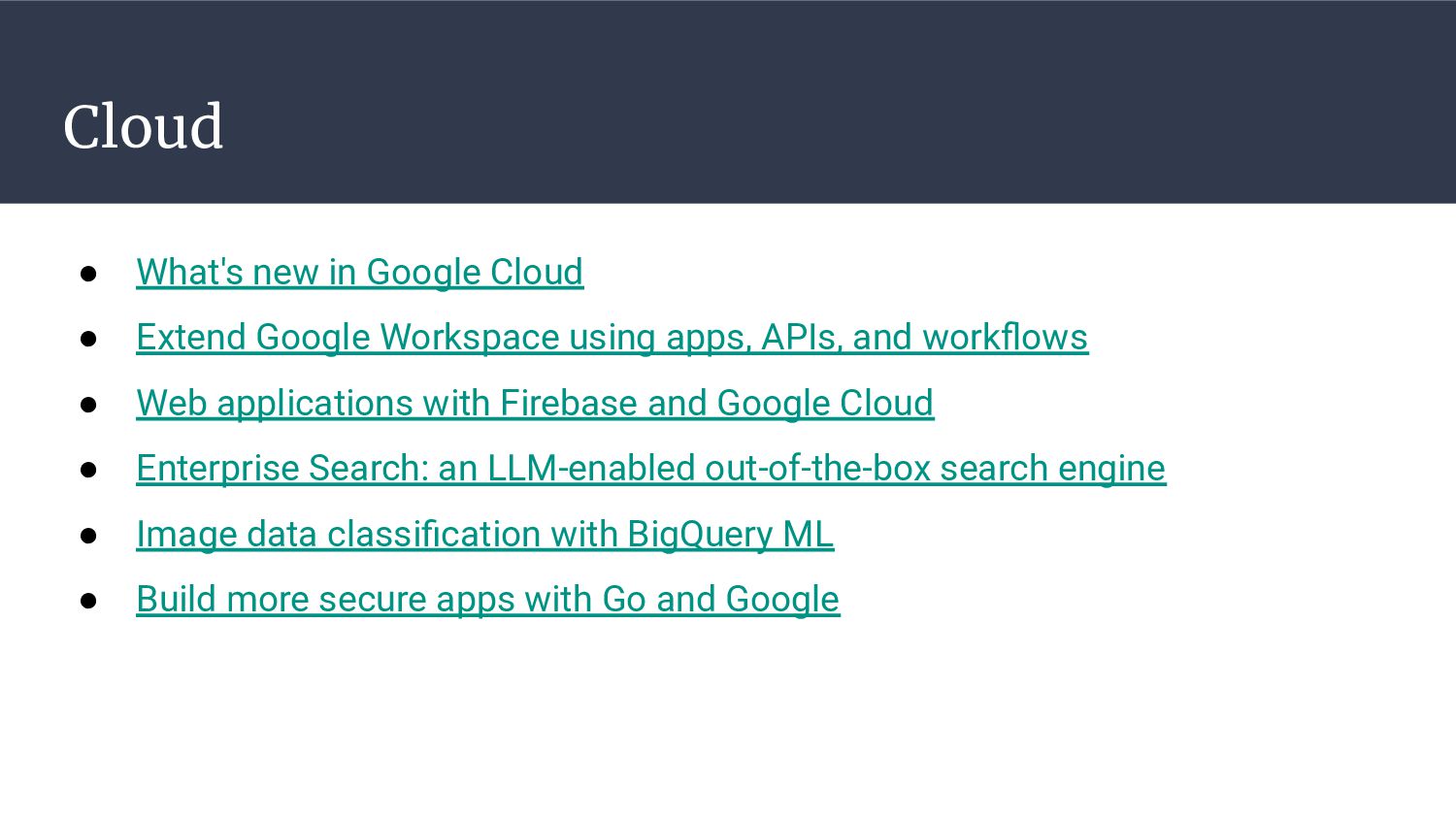 Workspace using apps, APIs, and workflows • Web applications with Firebase and Google Cloud • Enterprise Search: an LLM-enabled out-of-the-box search engine • Image data classification with BigQuery ML • Build more secure apps with Go and Google