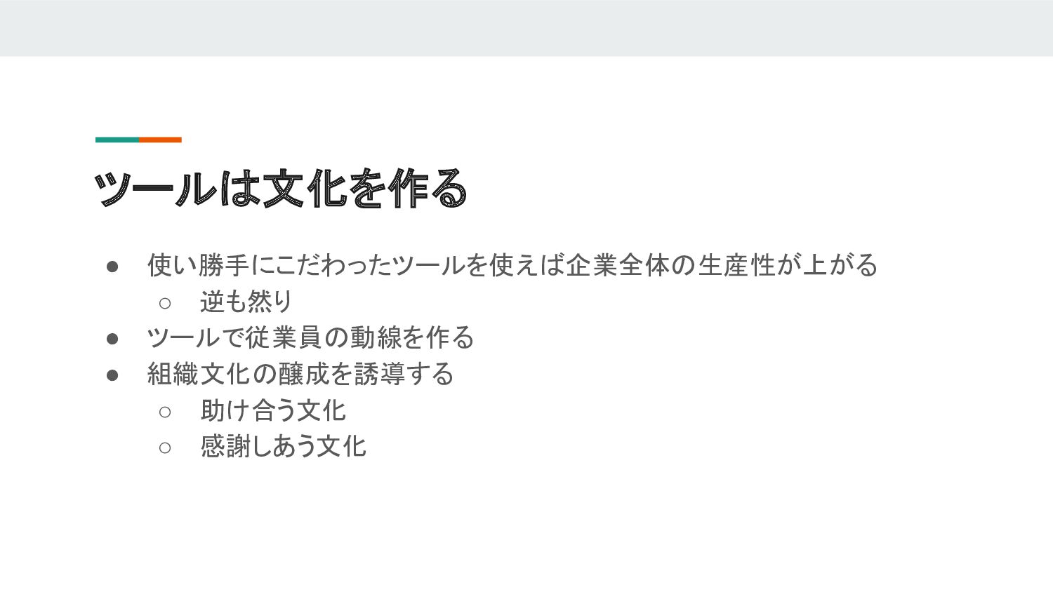 ツールは文化を作る • 使い勝手にこだわったツールを使えば企業全体の生産性が上がる ◦ 逆も然り • ツールで従業員の動線を作る • 組織文化の醸成を誘導する ◦