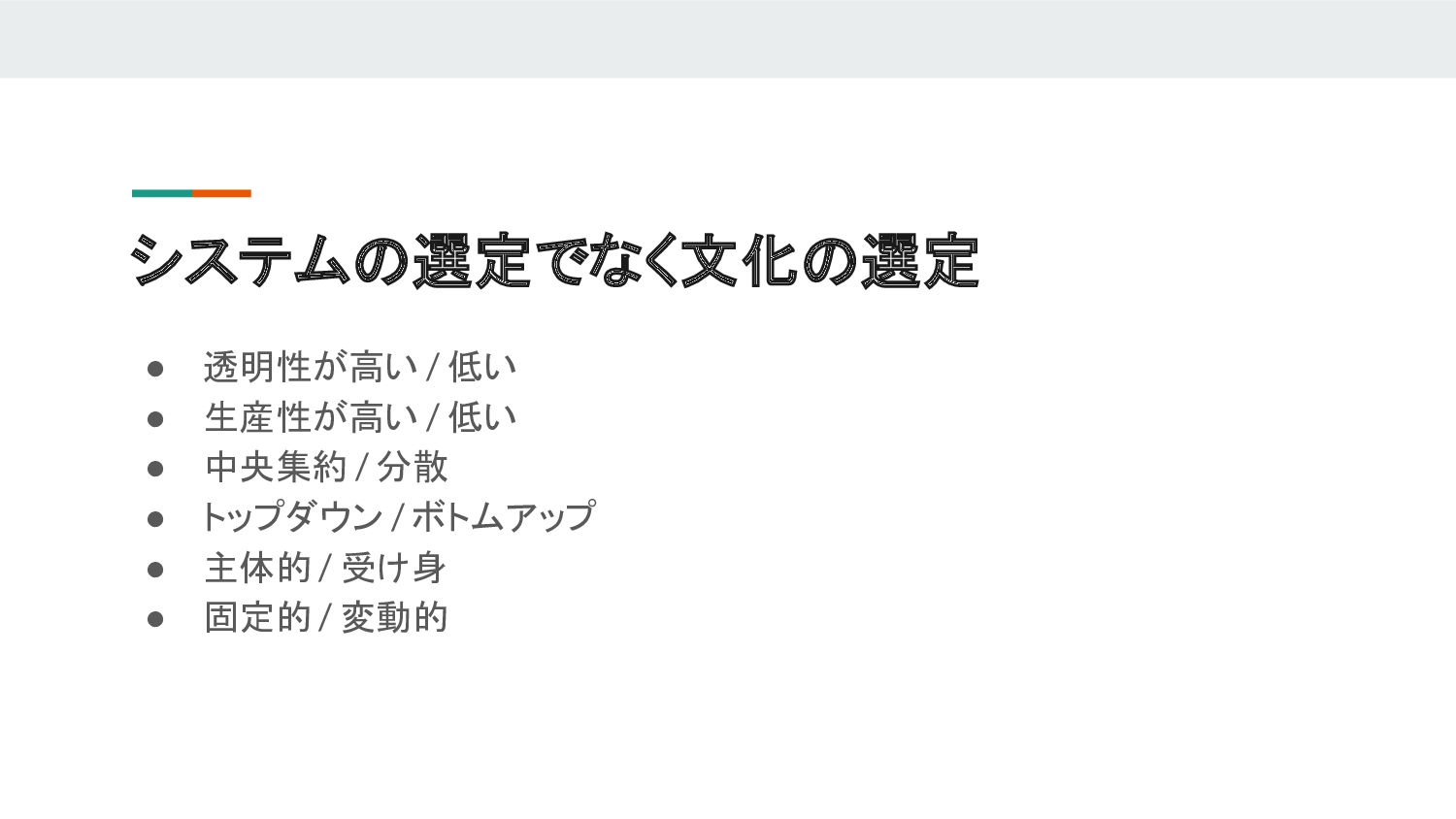 システムの選定でなく文化の選定 • 透明性が高い / 低い • 生産性が高い / 低い •