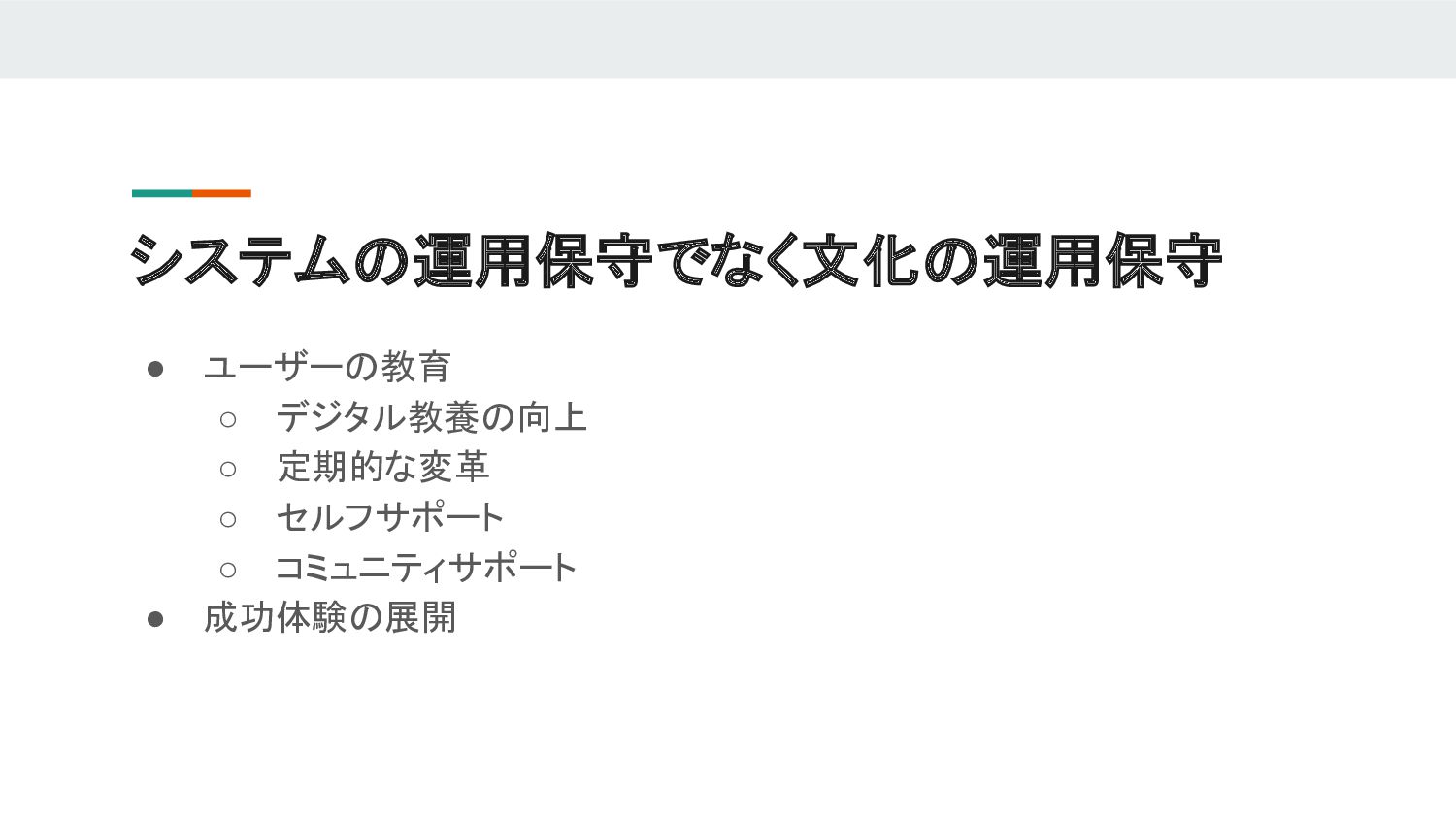 システムの運用保守でなく文化の運用保守 • ユーザーの教育 ◦ デジタル教養の向上 ◦ 定期的な変革 ◦ セルフサポート ◦