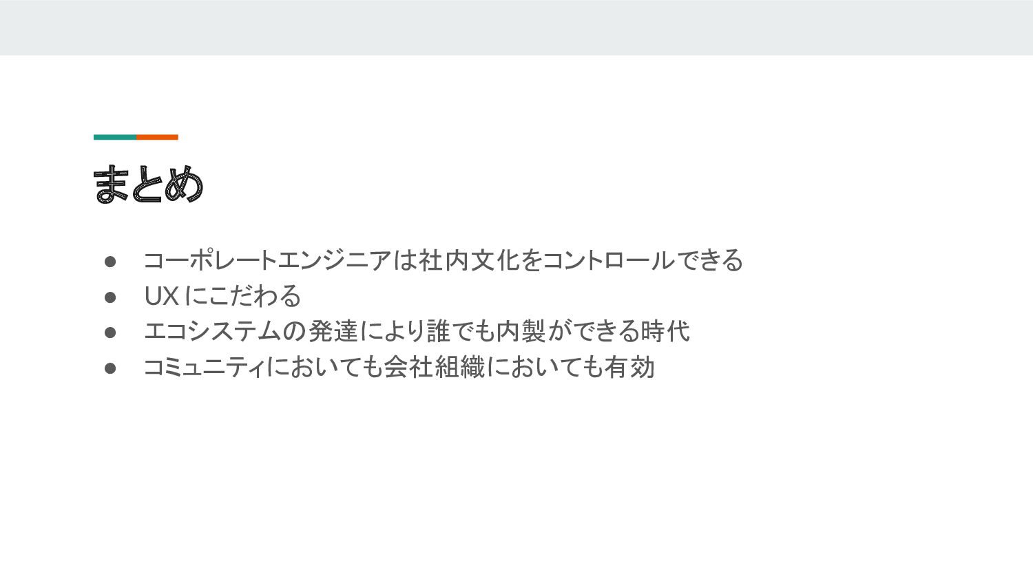 まとめ • コーポレートエンジニアは社内文化をコントロールできる • UX にこだわる • エコシステムの発達により誰でも内製ができる時代 • コミュニティにおいても会社組織においても有効