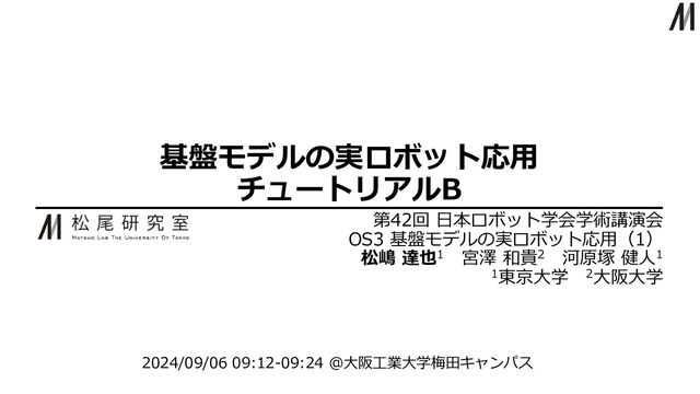 基盤モデルの実ロボット応用 チュートリアルB 第42回 日本ロボット学会学術講演会 OS3 基盤モデルの実ロボット応用(1) 松嶋 達也1 宮澤 和貴2