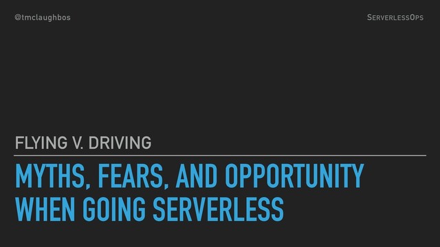 Going serverless is a lot like deciding to fly instead of driving. Flying is routinely safer than driving to your destination but requires a high level of trust in your airline and many are still scared. We’ll explore going serverless by confronting fears and examining it’s new issues.