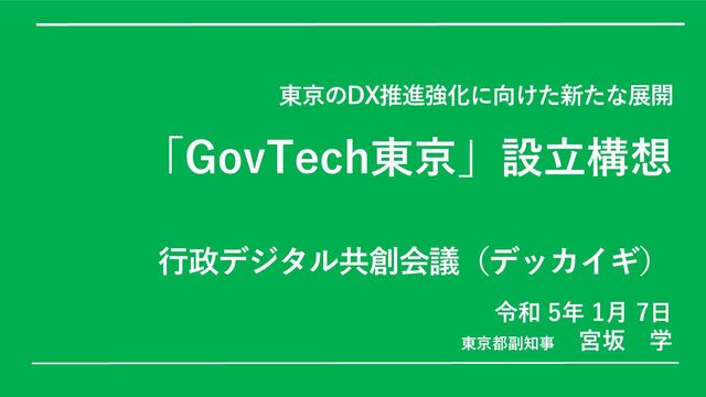東京のDX推進強化に向けた新たな展開 「GovTech東京」設立構想 令和 5年 1月 7日 東京都副知事 宮坂 学 行政デジタル共創会議(デッカイギ)