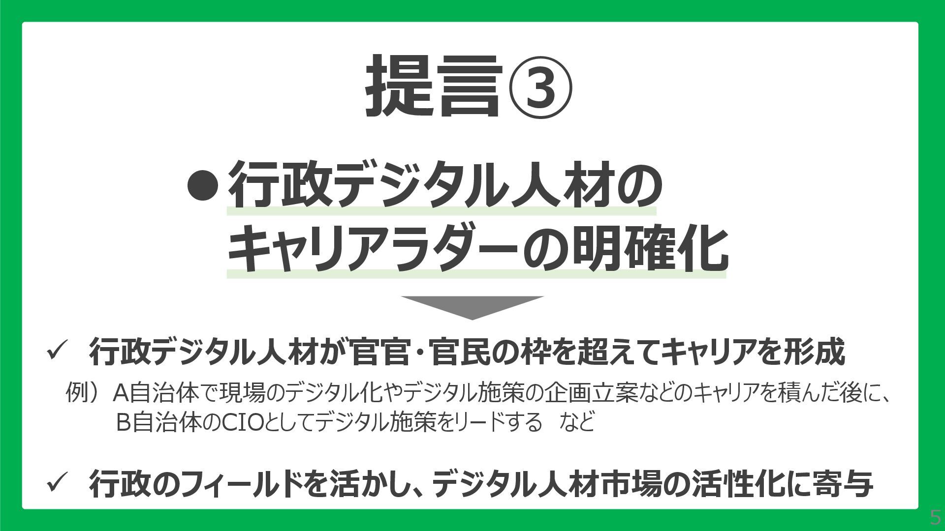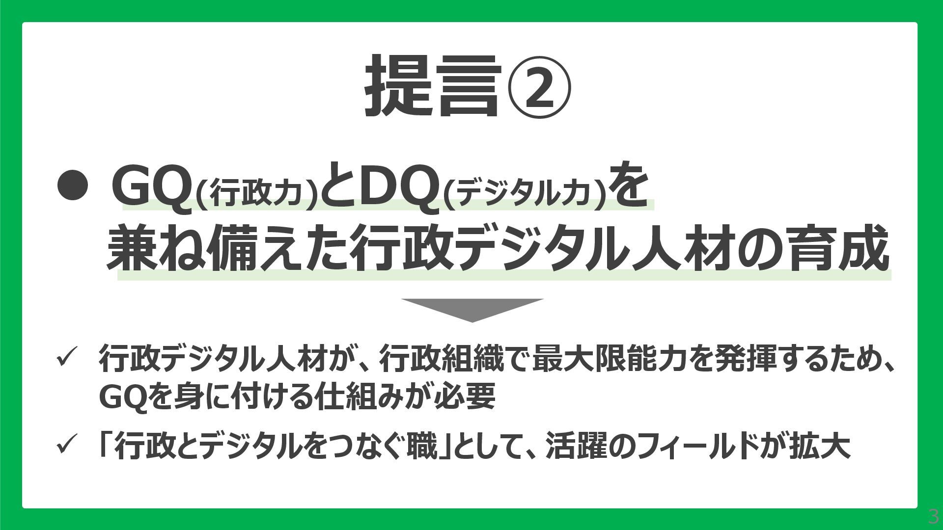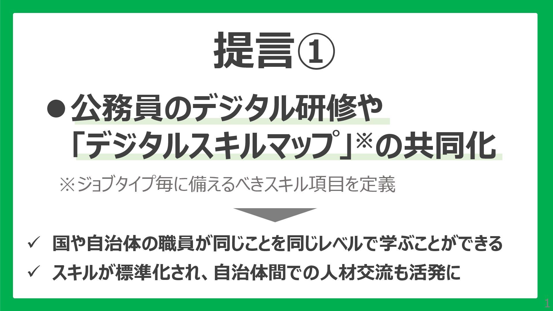 1 提言① ✓ 国や自治体の職員が同じことを同じレベルで学ぶことができる ✓ スキルが標準化され、自治体間での人材交流も活発に ⚫公務員のデジタル研修や 「デジタルスキルマップ」※の共同化 ※ジョブタイプ毎に備えるべきスキル項目を定義