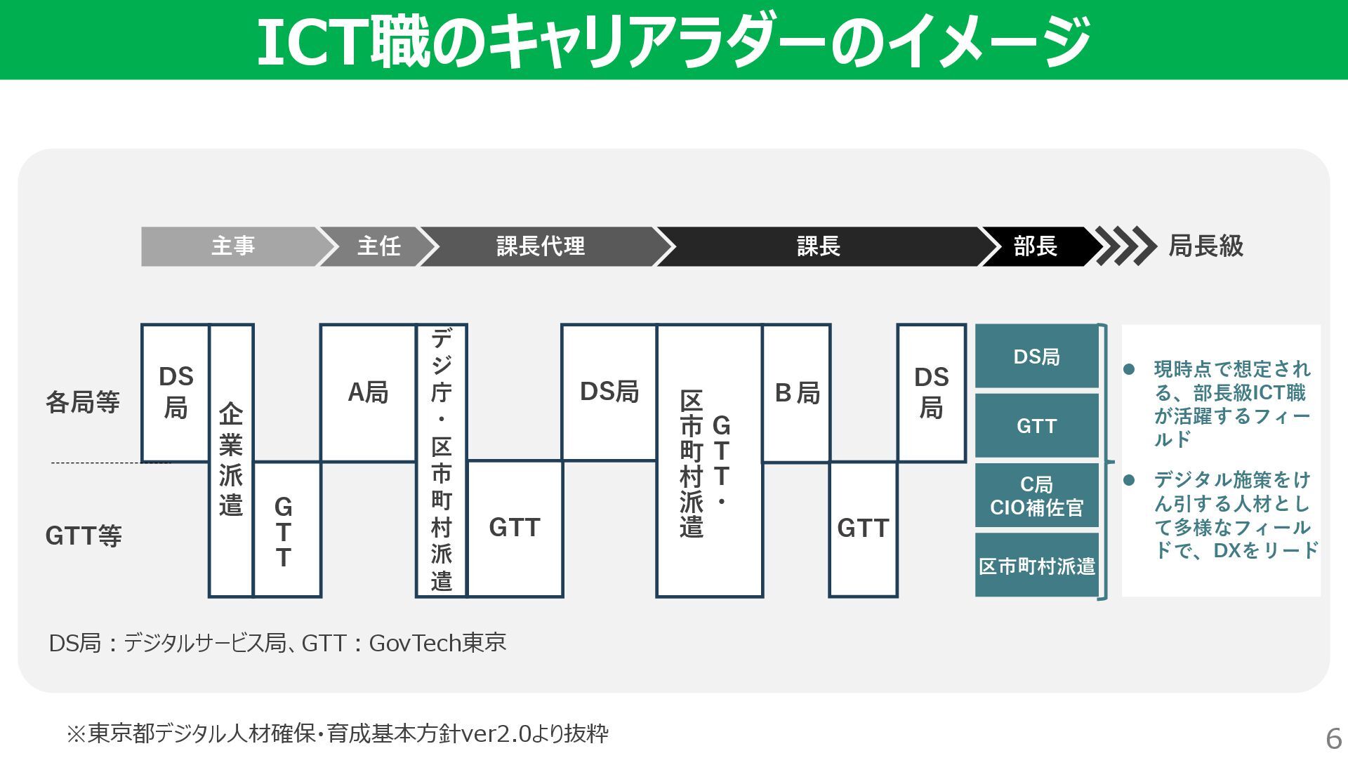 遣 G T T A局 デ ジ 庁 ・ 区 市 町 村 派 遣 GTT DS局 G T T ・ 区 市 町 村 派 遣 B局 GTT DS 局 DS局:デジタルサービス局、GTT:GovTech東京 ⚫ 現時点で想定され る、部長級ICT職 が活躍するフィー ルド ⚫ デジタル施策をけ ん引する人材とし て多様なフィール ドで、DXをリード ※東京都デジタル人材確保・育成基本方針ver2.0より抜粋 DS局 GTT C局 CIO補佐官 区市町村派遣 部長 課長 課長代理 主任 主事