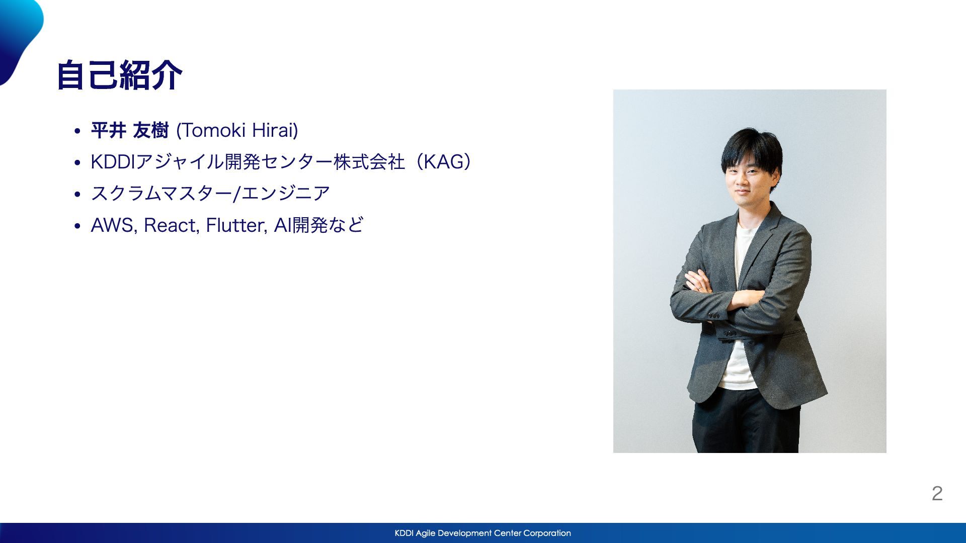 自己紹介 平井 友樹 (Tomoki Hirai) KDDIアジャイル開発センター株式会社(KAG) スクラムマスター/エンジニア AWS, React, Flutter,