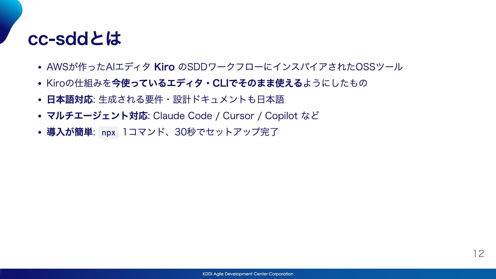 cc-sddとは AWSが作ったAIエディタ Kiro のSDDワークフローにインスパイアされたOSSツール Kiroの仕組みを今使っているエディタ・CLIでそのまま使えるようにしたもの 日本語対応: 生成される要件・設計ドキュメントも日本語 マルチエージェント対応: Claude Code