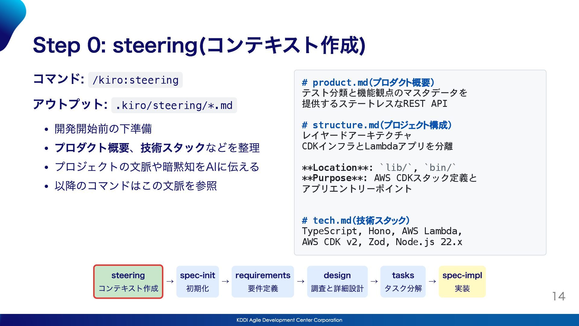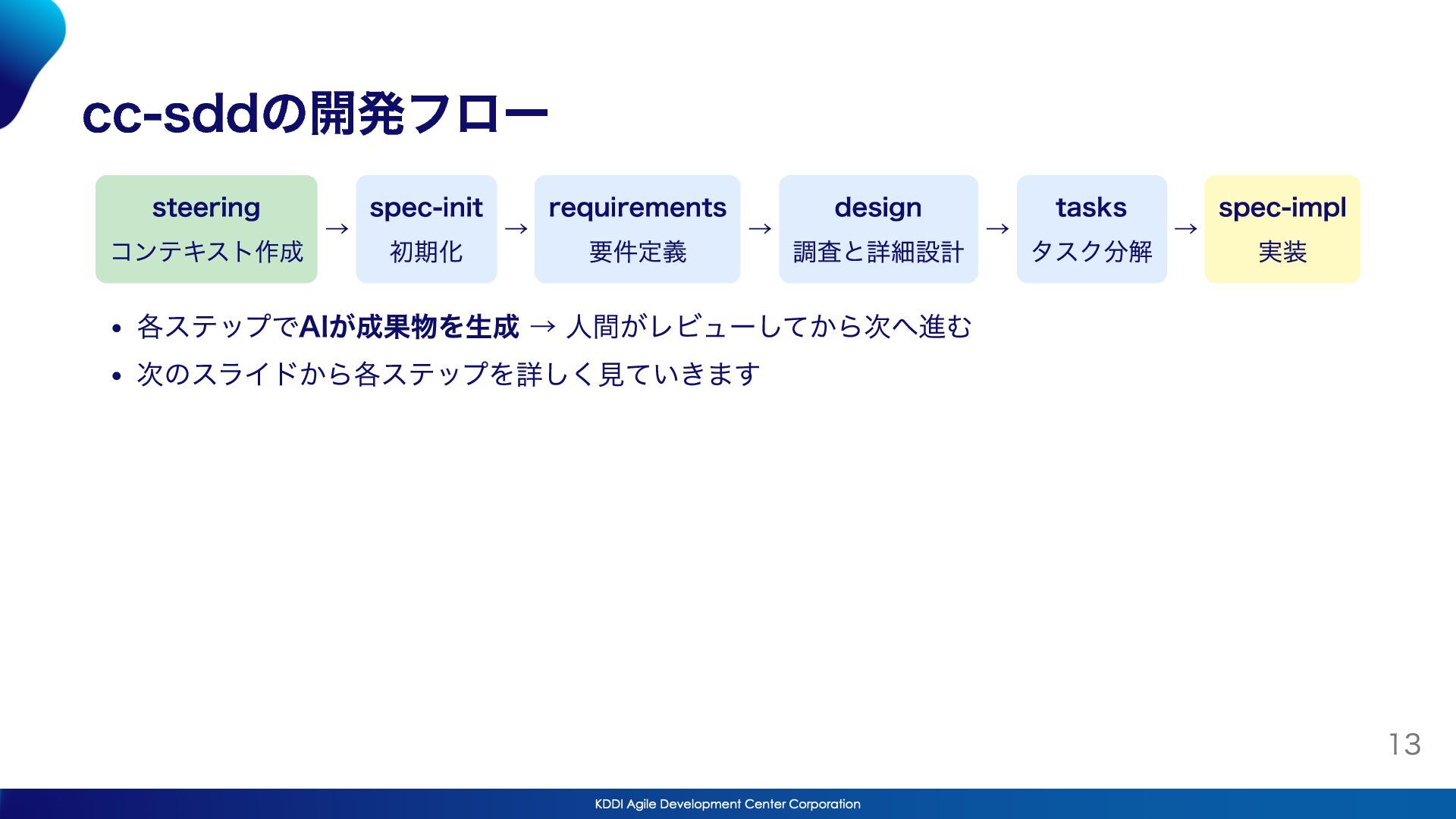 design 調査と詳細設計 → tasks タスク分解 → spec-impl 実装 各ステップでAIが成果物を生成 → 人間がレビューしてから次へ進む 次のスライドから各ステップを詳しく見ていきます 13