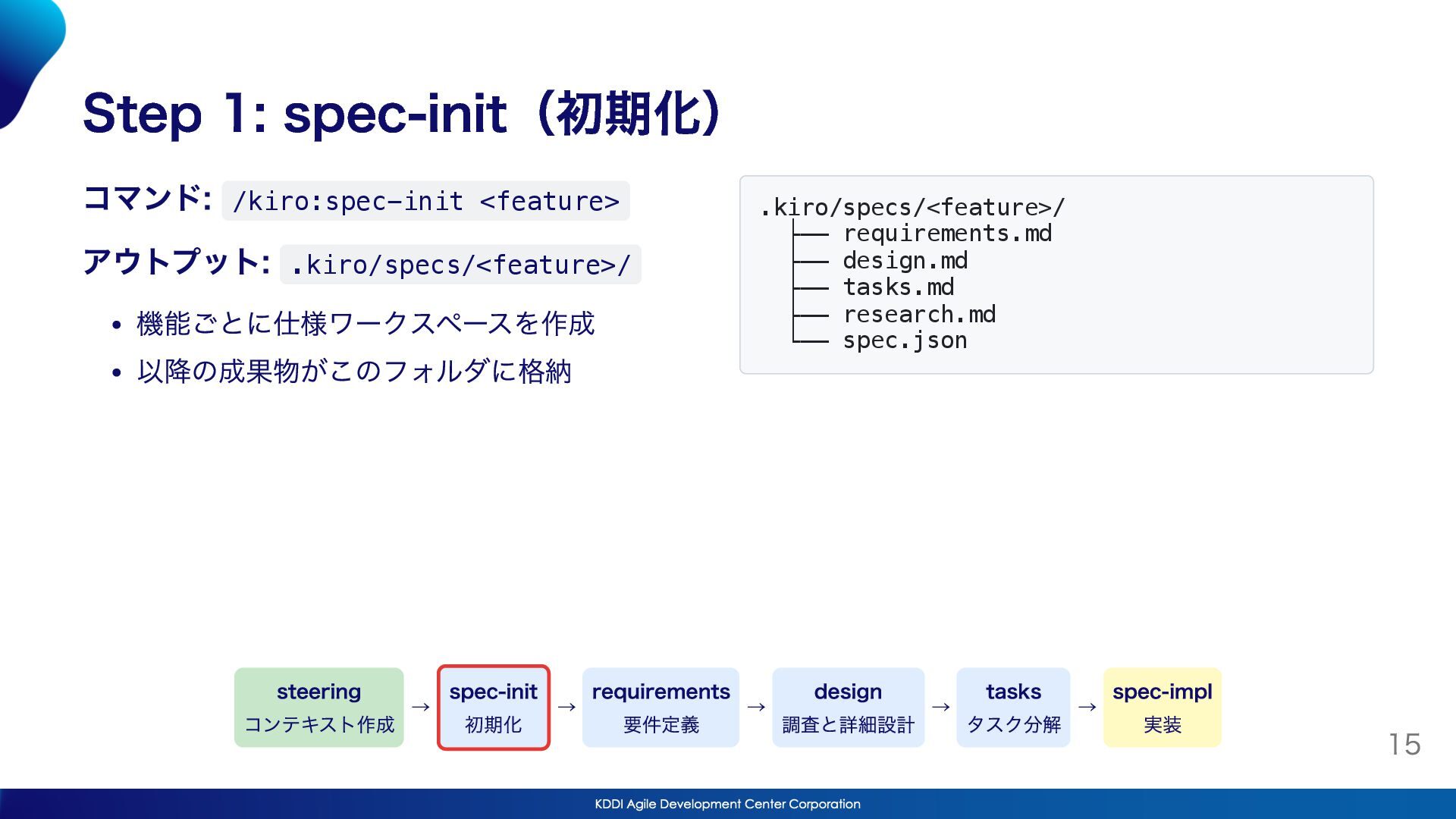 Step 1: spec-init(初期化) コマンド: /kiro:spec-init <feature> アウトプット: .kiro/specs/<feature>/ 機能ごとに仕様ワークスペースを作成 以降の成果物がこのフォルダに格納