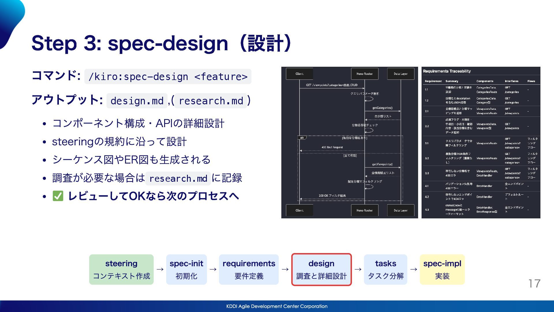 受入条件の形式 EARS (Easy Approach to Requirements Syntax) 形式 機能要件・非機能要件を構造化 レビューしてOKなら次のプロセスへ ... ### Requirement 1: テスト分類一覧取得 **Objective:** As a API利用者, I want テスト分類の一覧を取得したい, so that どの分類が利用可能か把握できる #### Acceptance Criteria 1. When APIが分類一覧取得リクエストを受信した場合, the Test Viewpoint API shall 11種類の分類(画面、画面遷移、入力あり、 ファイル入力、ファイル出力、CRUD、検索、 メール、バッチ、バックエンド、Bluetooth)とその定義を返却する 2. The Test Viewpoint API shall 各分類について分類名(name)と詳細説明(description) を含むJSON形式で応答する ... steering コンテキスト作成 → spec-init 初期化 → requirements 要件定義 → design 調査と詳細設計 → tasks タスク分解 → spec-impl 実装 16
