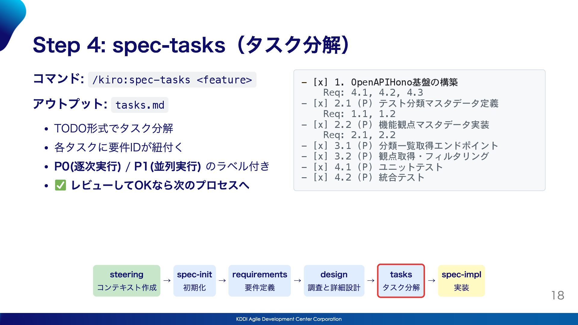 Step 4: spec-tasks(タスク分解) コマンド: /kiro:spec-tasks <feature> アウトプット: tasks.md TODO形式でタスク分解 各タスクに要件IDが紐付く