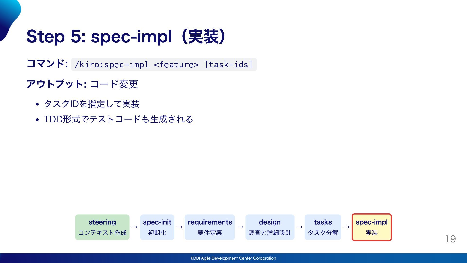 Step 5: spec-impl(実装) コマンド: /kiro:spec-impl <feature> [task-ids] アウトプット: コード変更 タスクIDを指定して実装