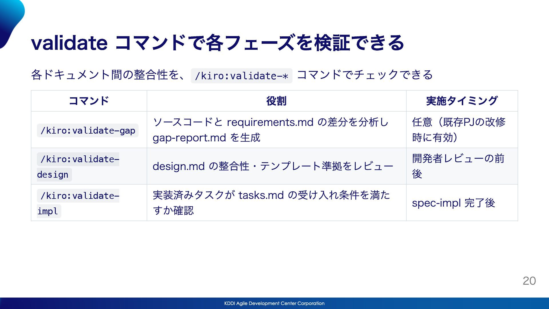 requirements.md の差分を分析し gap-report.md を生成 任意(既存PJの改修 時に有効) /kiro:validate- design design.md の整合性・テンプレート準拠をレビュー 開発者レビューの前 後 /kiro:validate- impl 実装済みタスクが tasks.md の受け入れ条件を満た すか確認 spec-impl 完了後 20