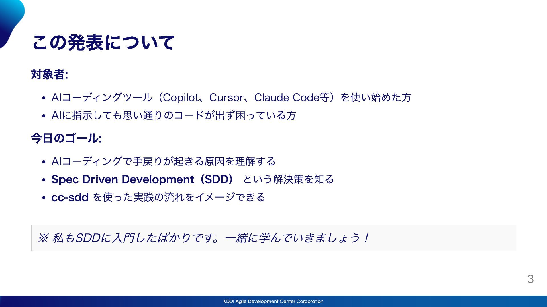 この発表について 対象者: AIコーディングツール(Copilot、Cursor、Claude Code等)を使い始めた方 AIに指示しても思い通りのコードが出ず困っている方 今日のゴール: AIコーディングで手戻りが起きる原因を理解する Spec Driven Development(SDD)