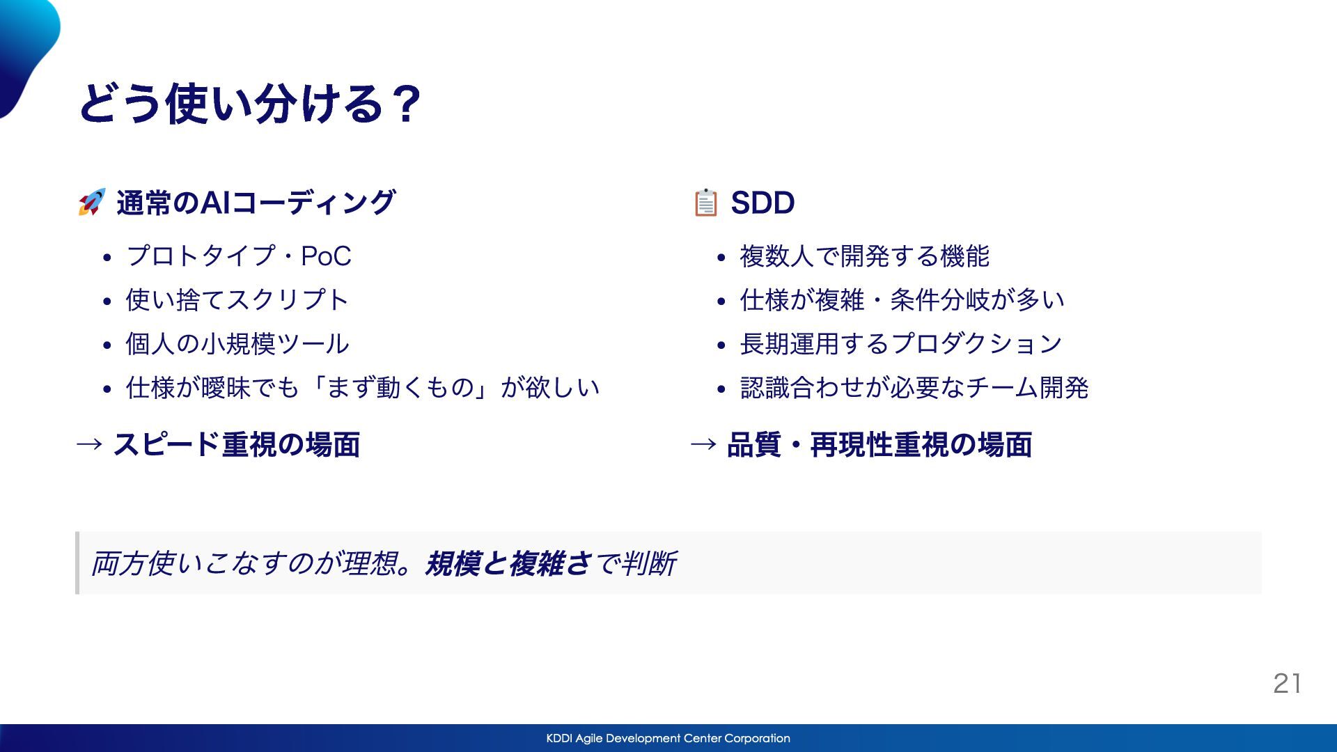 どう使い分ける? 通常のAIコーディング プロトタイプ・PoC 使い捨てスクリプト 個人の小規模ツール 仕様が曖昧でも「まず動くもの」が欲しい → スピード重視の場面 SDD 複数人で開発する機能