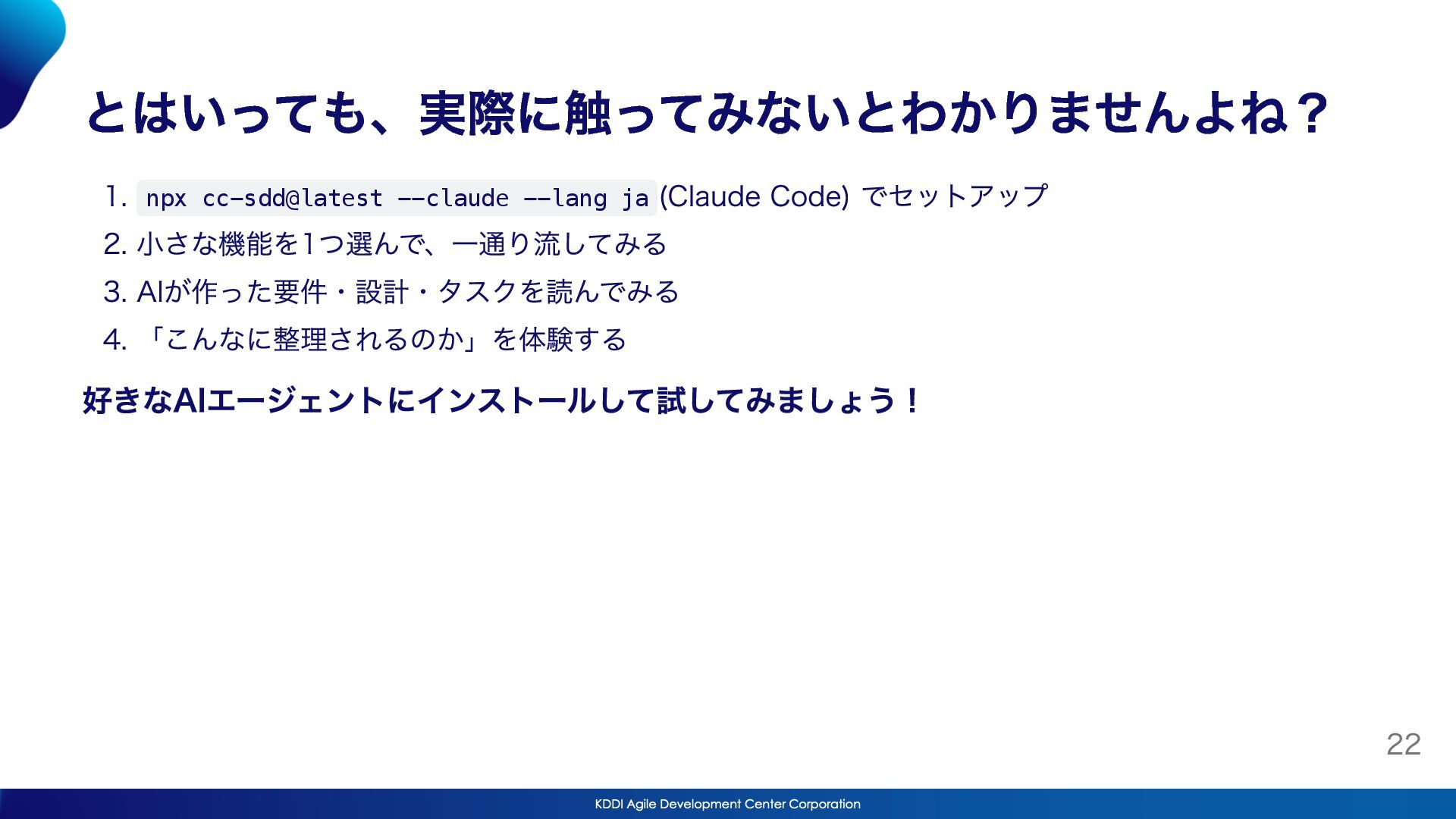 2. 小さな機能を1つ選んで、一通り流してみる 3. AIが作った要件・設計・タスクを読んでみる 4. 「こんなに整理されるのか」を体験する 好きなAIエージェントにインストールして試してみましょう! 22