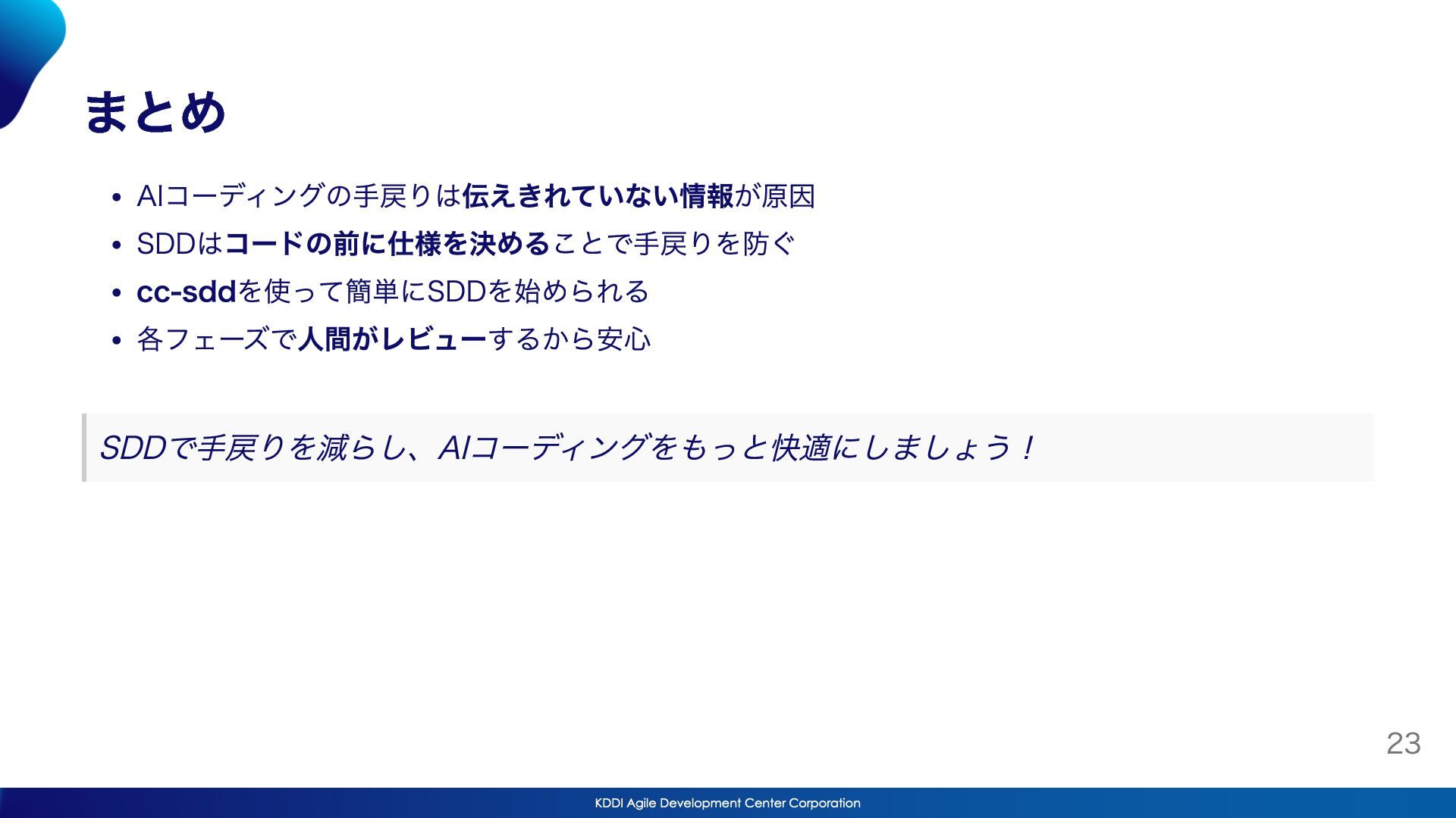 まとめ AIコーディングの手戻りは伝えきれていない情報が原因 SDDはコードの前に仕様を決めることで手戻りを防ぐ cc-sddを使って簡単にSDDを始められる 各フェーズで人間がレビューするから安心 SDDで手戻りを減らし、AIコーディングをもっと快適にしましょう! 23