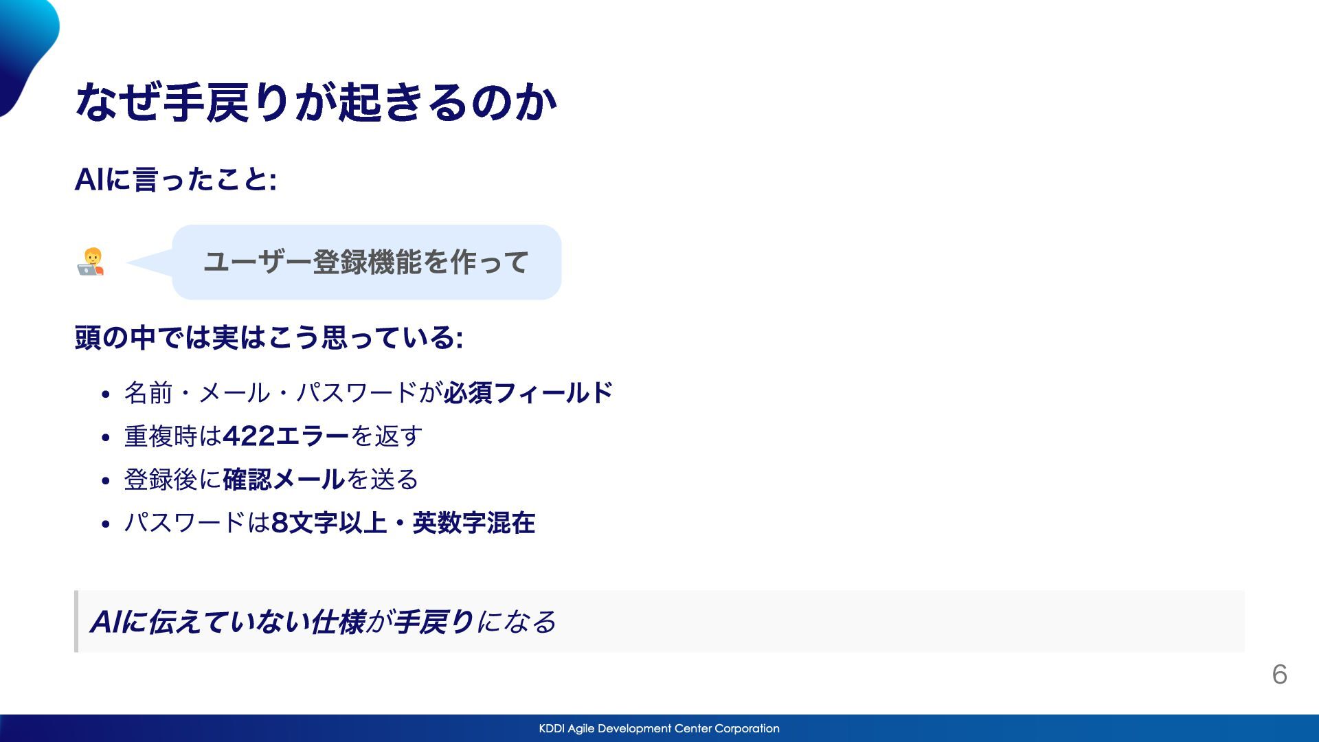 なぜ手戻りが起きるのか AIに言ったこと: 頭の中では実はこう思っている: 名前・メール・パスワードが必須フィールド 重複時は422エラーを返す 登録後に確認メールを送る パスワードは8文字以上・英数字混在 AIに伝えていない仕様が手戻りになる ユーザー登録機能を作って 6