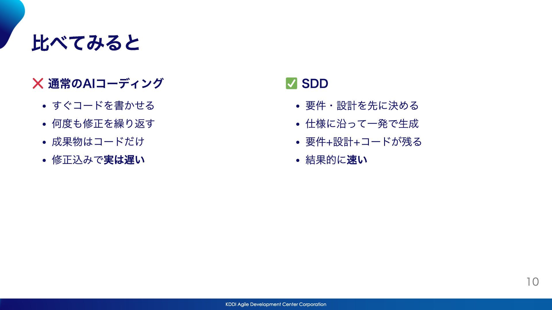 比べてみると 通常のAIコーディング すぐコードを書かせる 何度も修正を繰り返す 成果物はコードだけ 修正込みで実は遅い SDD 要件・設計を先に決める 仕様に沿って一発で生成 要件+設計+コードが残る