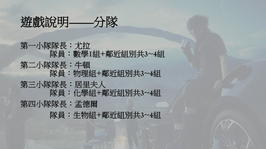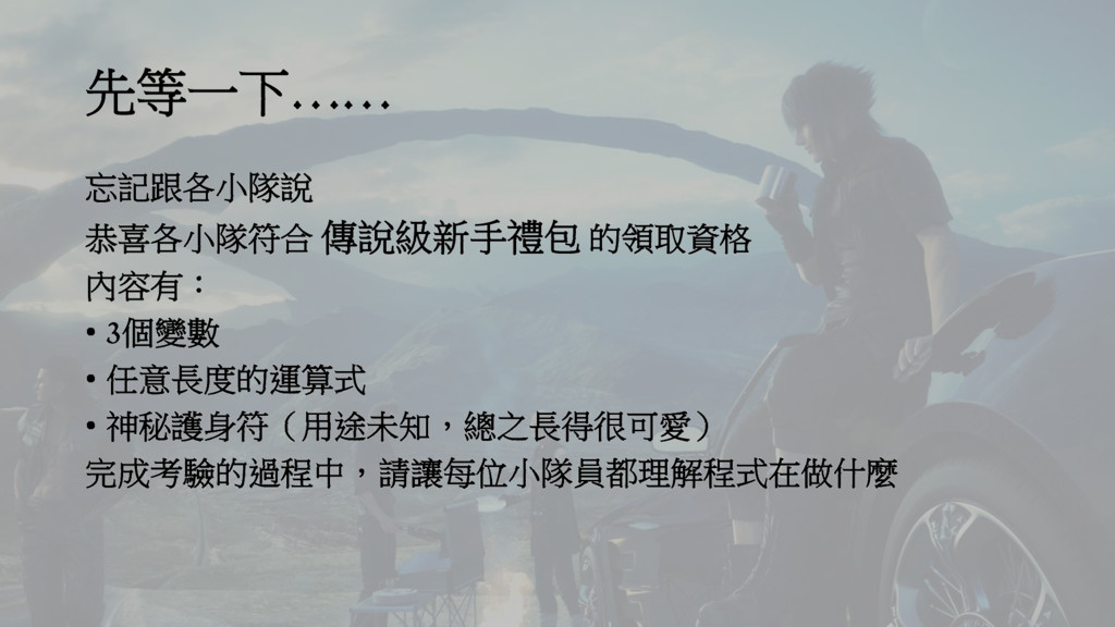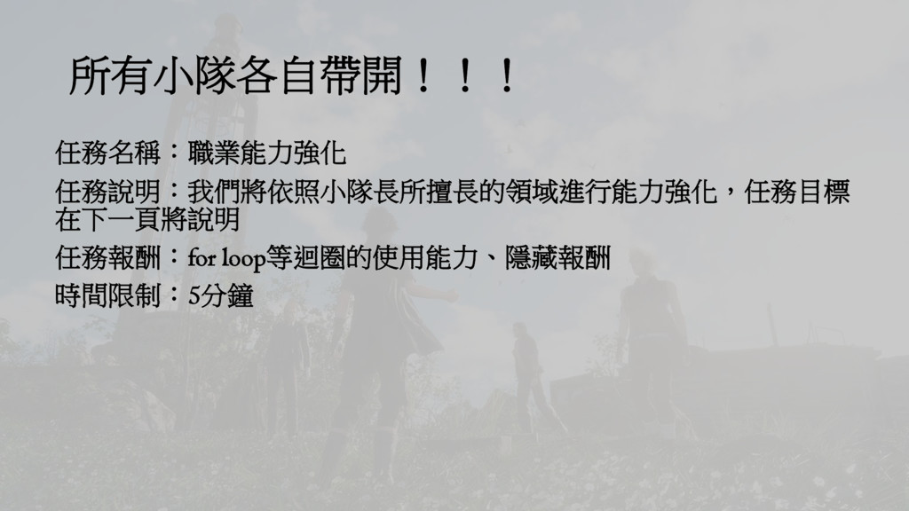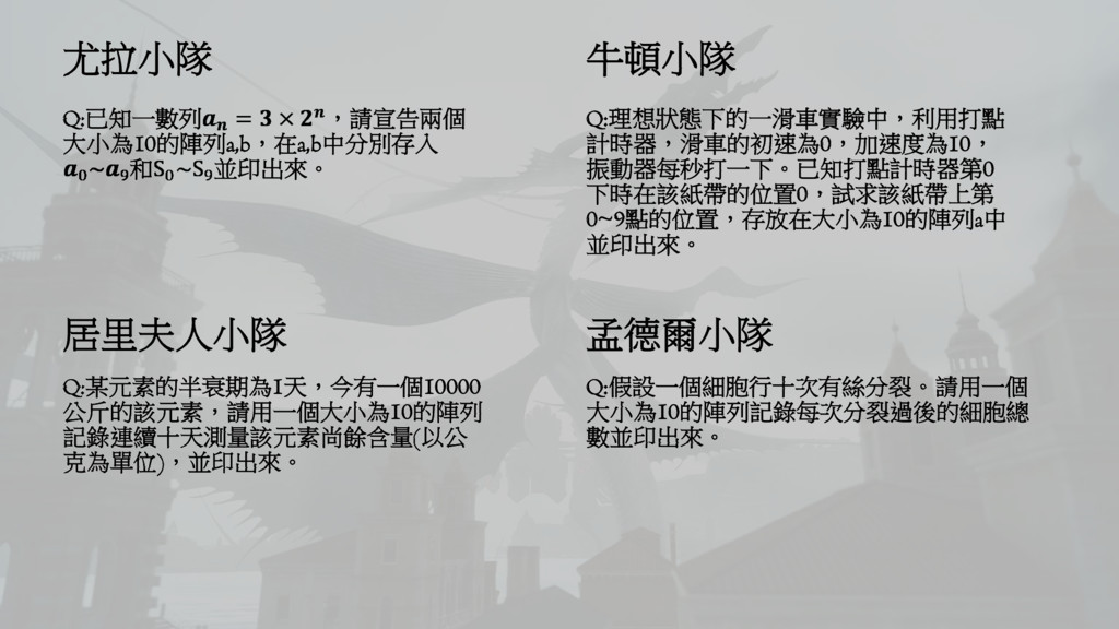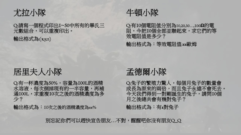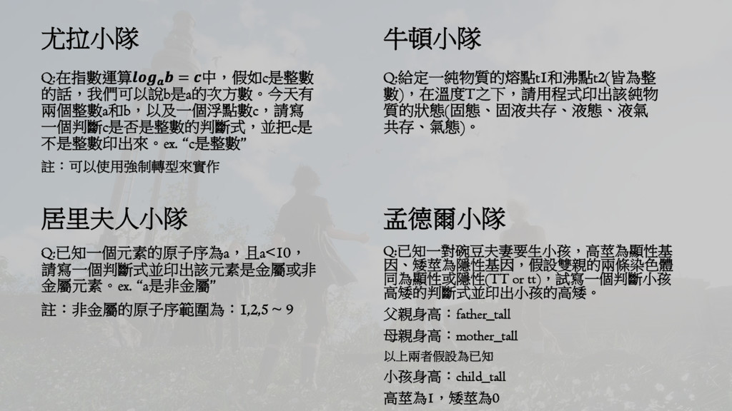 居里夫人小隊 牛頓小隊 孟德爾小隊 Q:給定一純物質的熔點t1和沸點t2(皆為整 數),在溫度T之下,請用程式印出該純物 質的狀態(固態、固液共存、液態、液氣 共存、氣態)。 Q:已知一個元素的原子序為a,且a<10, 請寫一個判斷式並印出該元素是金屬或非 金屬元素。ex. “a是非金屬” 註:非金屬的原子序範圍為:1,2,5 ~ 9 Q:已知一對碗豆夫妻要生小孩,高莖為顯性基 因、矮莖為隱性基因,假設雙親的兩條染色體 同為顯性或隱性(TT or tt),試寫一個判斷小孩 高矮的判斷式並印出小孩的高矮。 父親身高:father_tall 母親身高:mother_tall 以上兩者假設為已知 小孩身高:child_tall 高莖為1,矮莖為0
