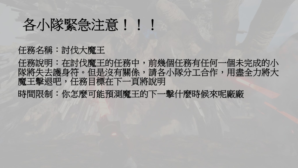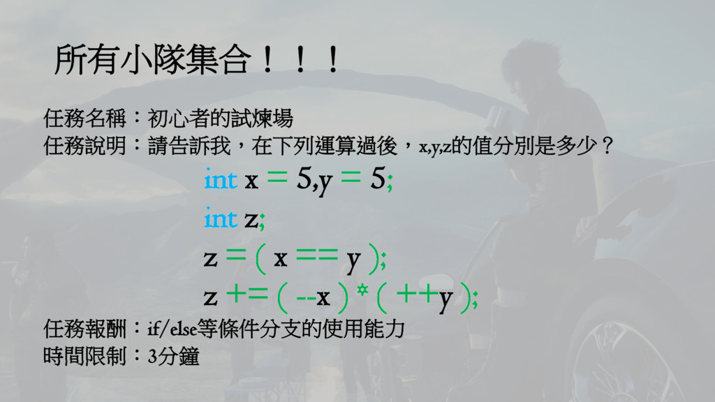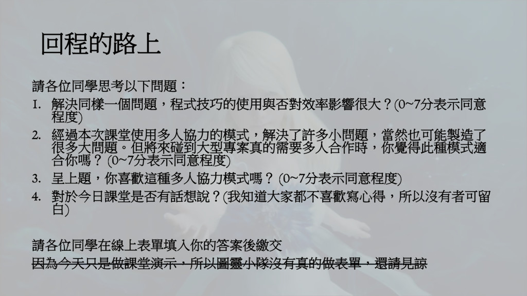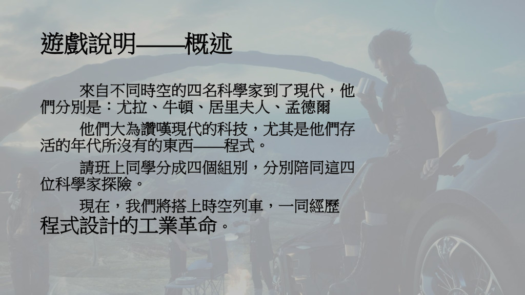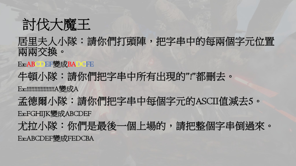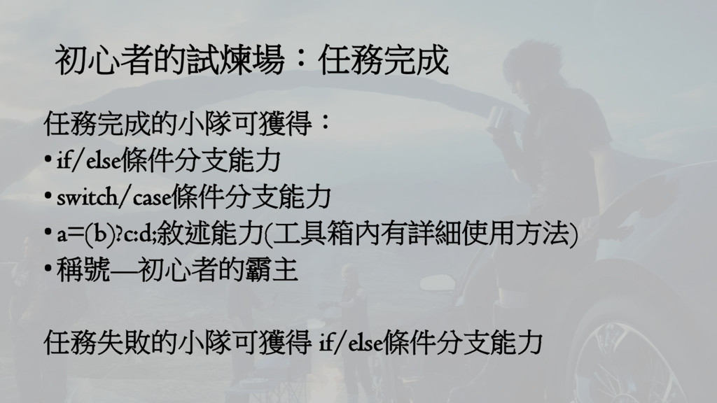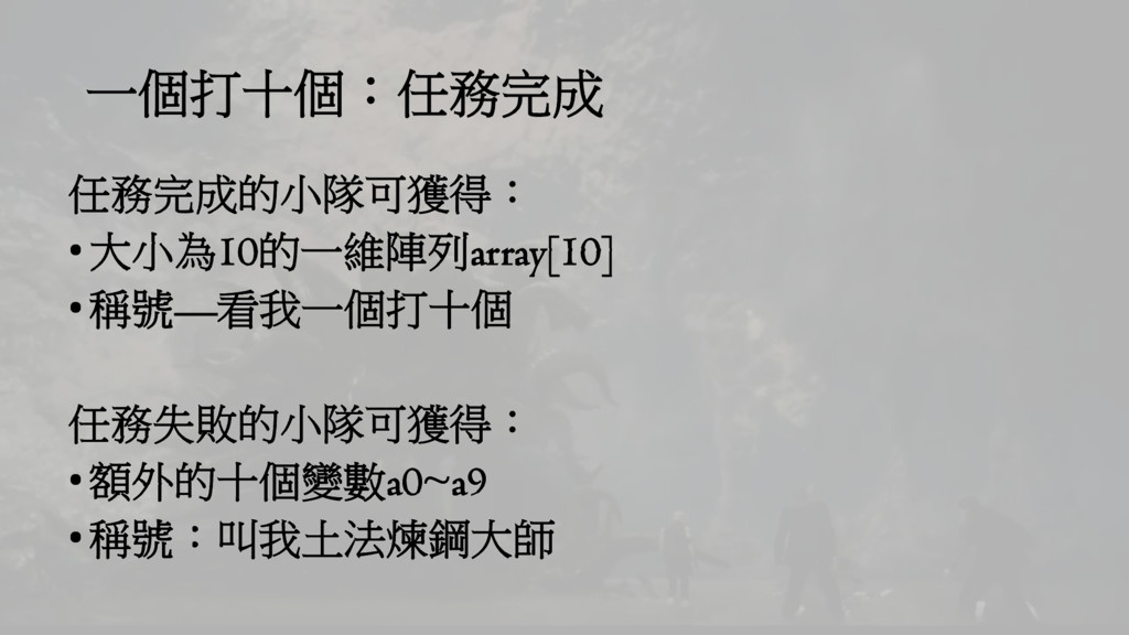 居里夫人小隊 牛頓小隊 孟德爾小隊 Q:給定一純物質的熔點t1和沸點t2(皆為整 數),在溫度T之下,請用程式印出該純物 質的狀態(固態、固液共存、液態、液氣 共存、氣態)。 Q:已知一個元素的原子序為a,且a<10, 請寫一個判斷式並印出該元素是金屬或非 金屬元素。ex. “a是非金屬” 註:非金屬的原子序範圍為:1,2,5 ~ 9 Q:已知一對碗豆夫妻要生小孩,高莖為顯性基 因、矮莖為隱性基因,假設雙親的兩條染色體 同為顯性或隱性(TT or tt),試寫一個判斷小孩 高矮的判斷式並印出小孩的高矮。 父親身高:father_tall 母親身高:mother_tall 以上兩者假設為已知 小孩身高:child_tall 高莖為1,矮莖為0